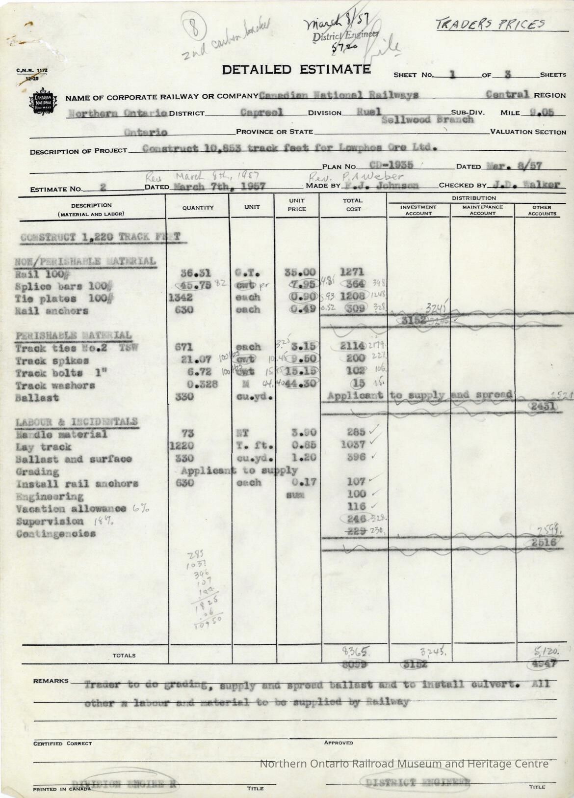 Document, CN Detailed Estimate, Construct 10,853 Track Feet for Lowphos Ore Limited.Collection