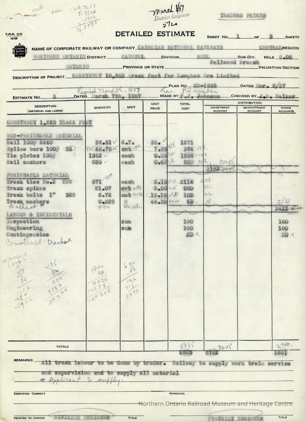 Document, CN Detailed Estimate, Construct 10,853 Track Feet for Lowphos Ore Limited.Collection