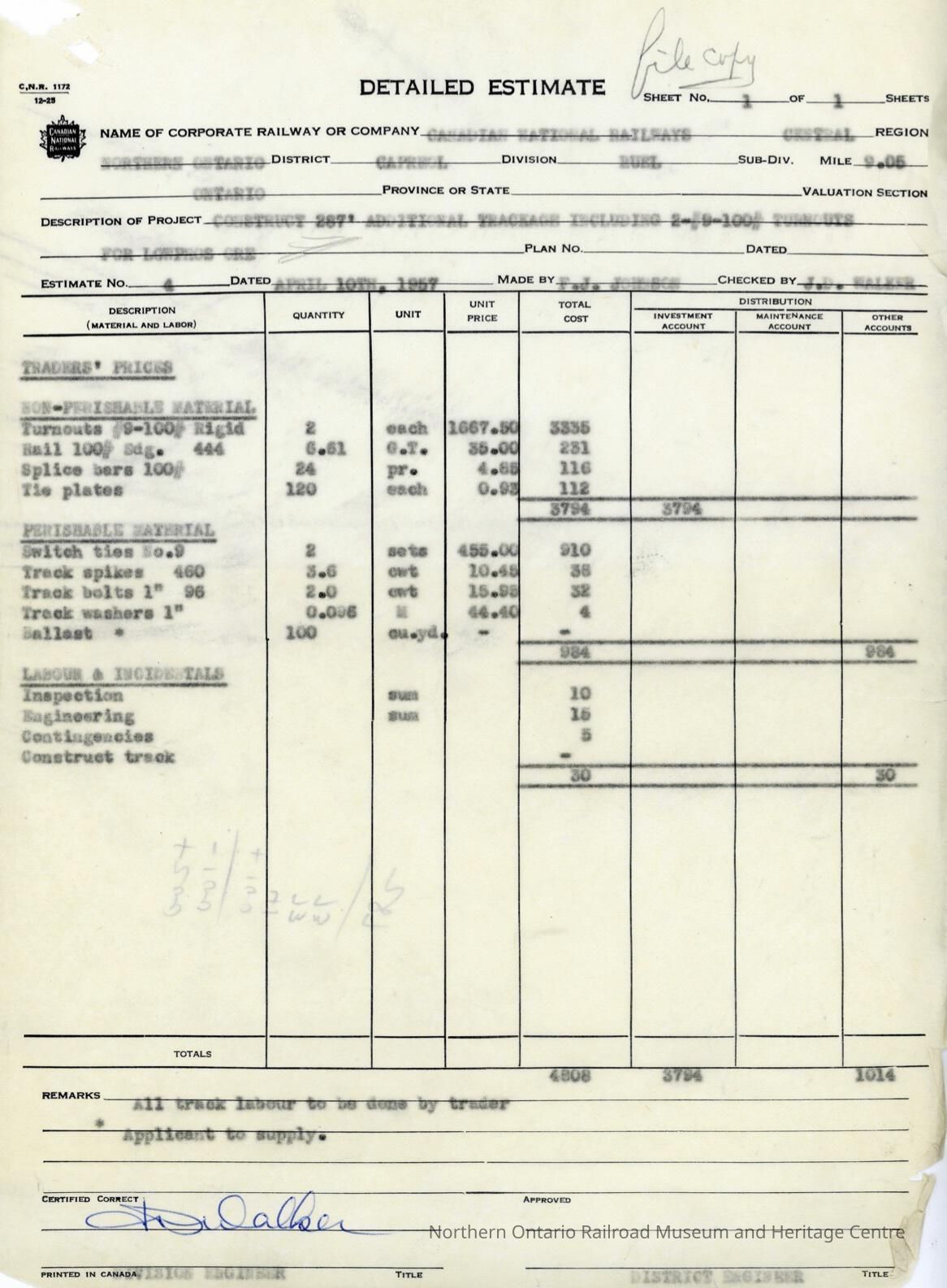 Document, CN Detailed Estimate, Construct 267 feet Additional Trackage Including 2-9-100 Turncuts for Lowphos Ore.Collection