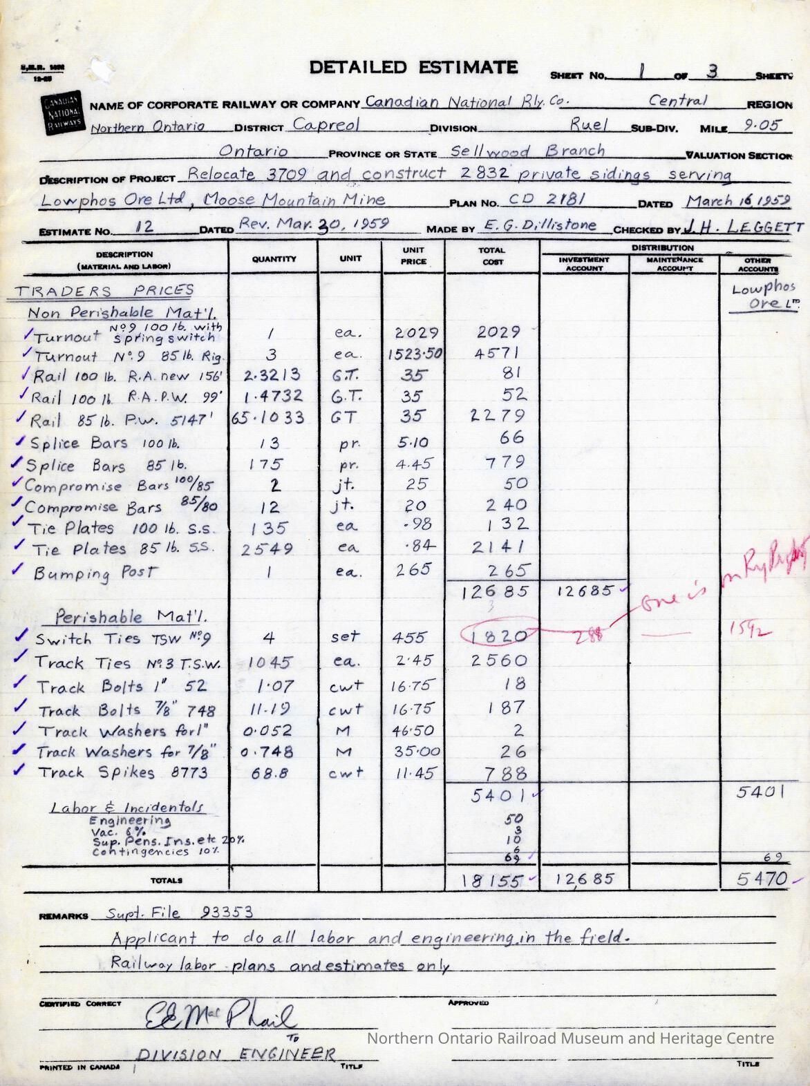 Document, CN Detailed Estimate, Relocate 3709 and Construct 2832 Pricate Sidings Serving Lowphos Ore Limited, Moose Mountain Mine.Collection