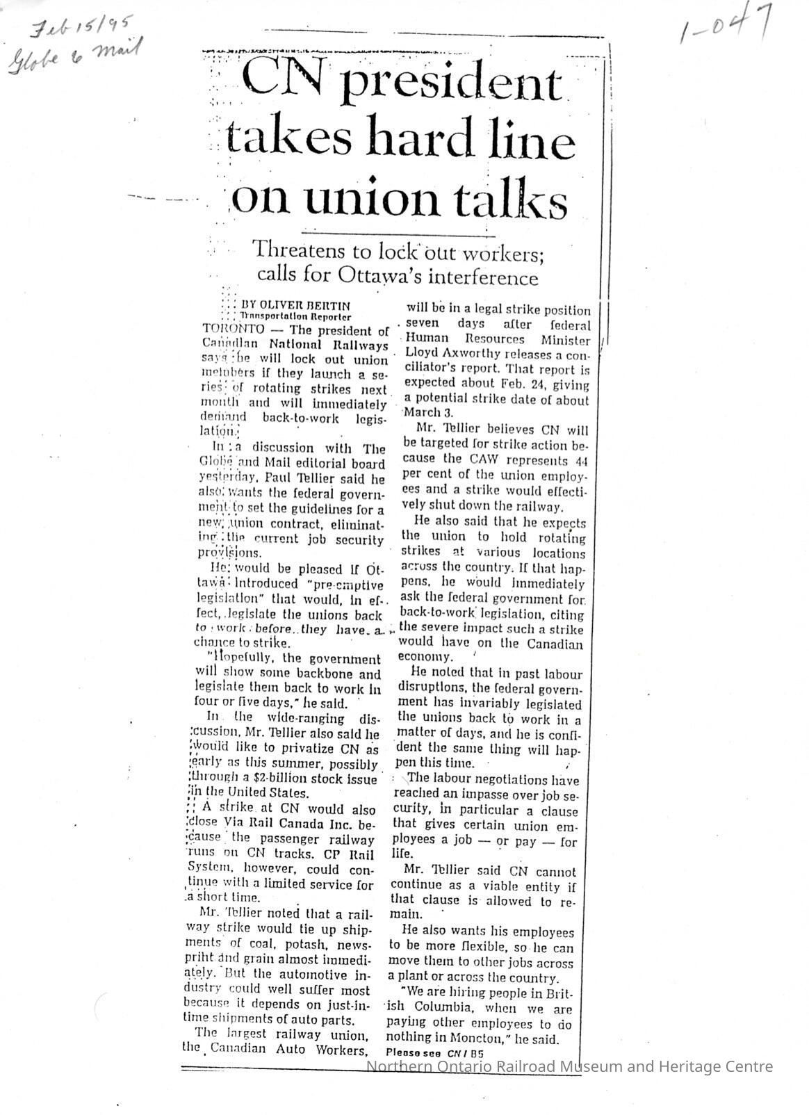 Document, Cn President takes hard line on union talks.Collection