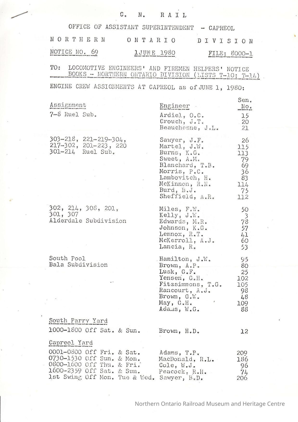 Document, CN Rail Office of Assistant Superintendent, Engine Crew Assignments At Capreol as of June 1, 1980.Collection