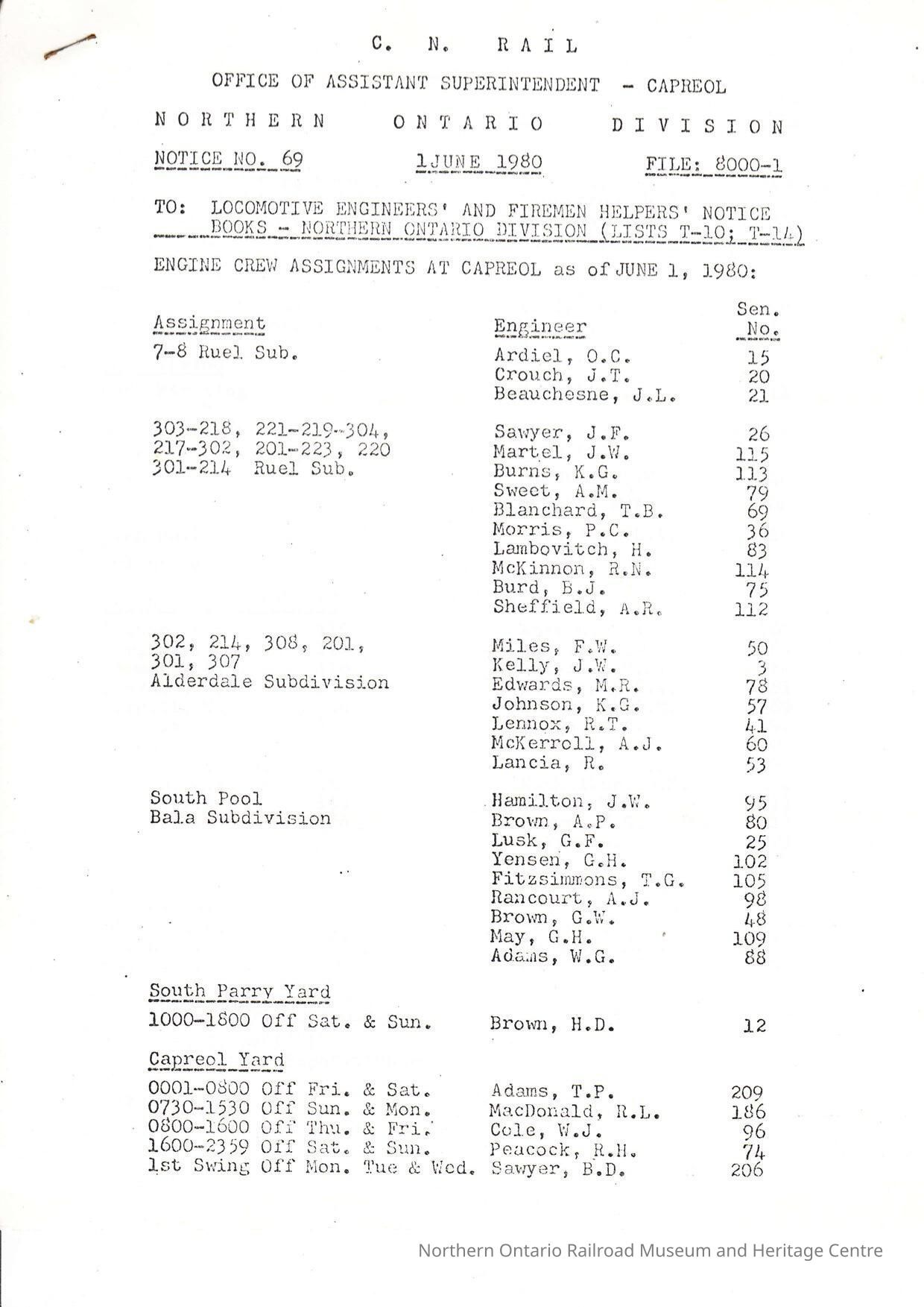 Document, CN Rail Office of Assistant Superintendent, Engine Crew Assignments At Capreol as of June 1, 1980.Collection