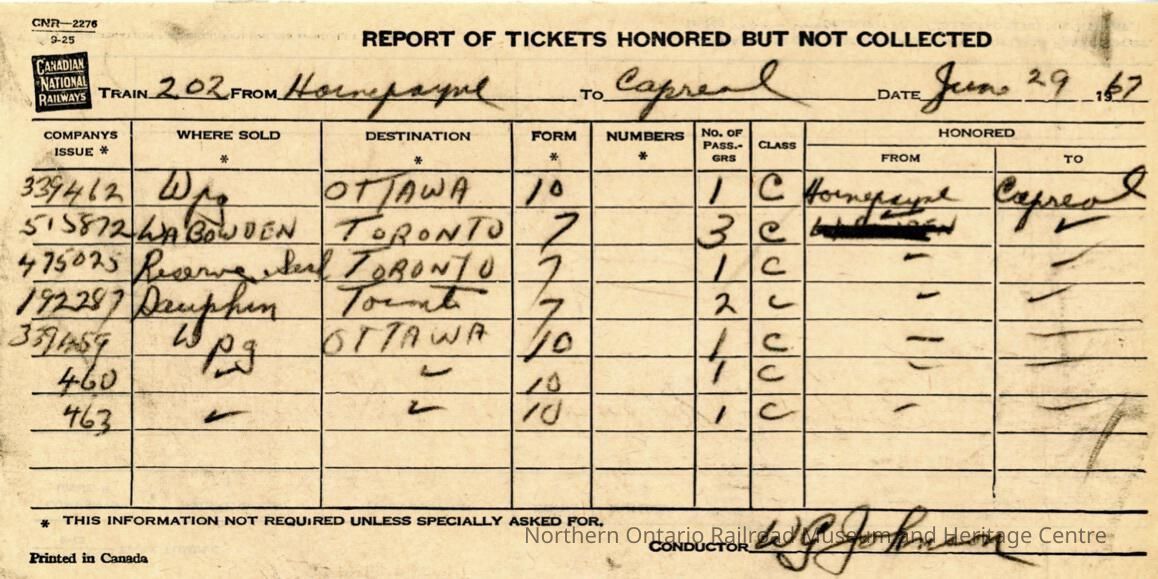 Document, CN Report of Tickets Honoured but not Collected.Collection