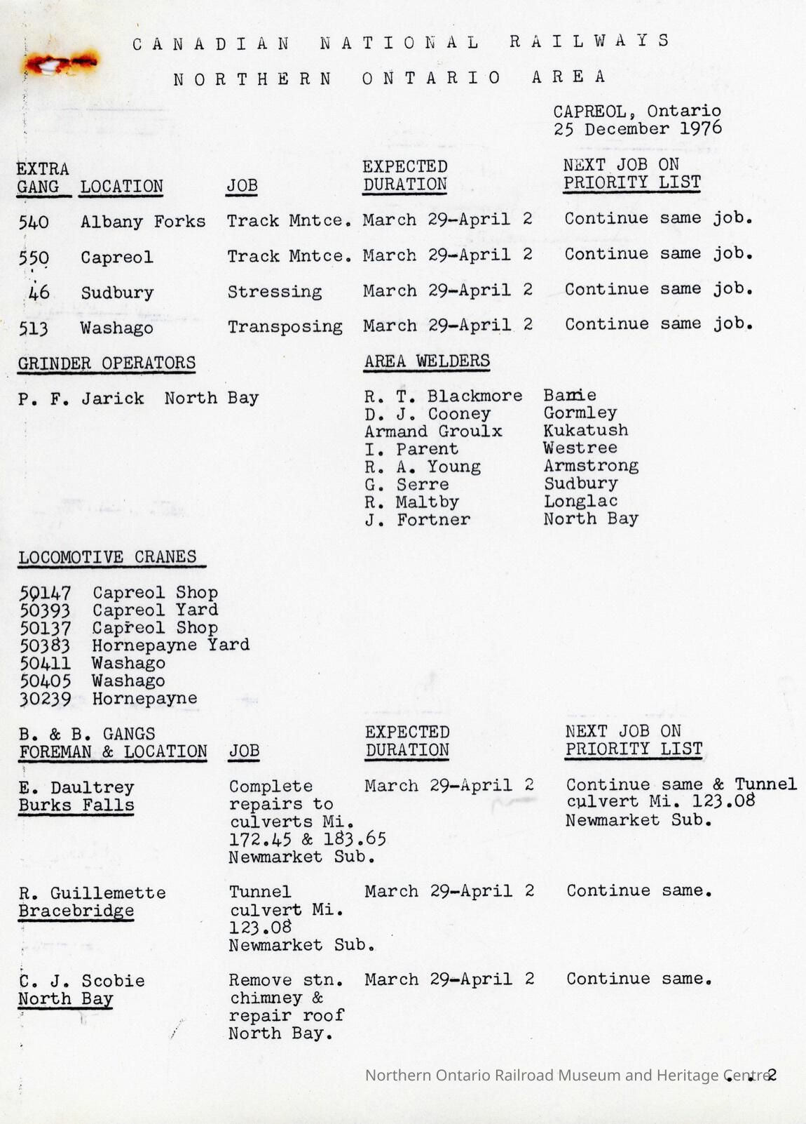 Document, CNR, Northern Ontario Area, Capreol Ontario Location Reports, 25 December 1976.Collection