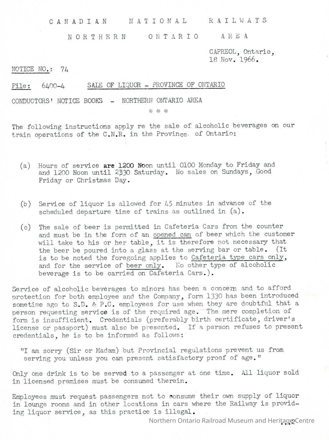 Document, CNR Sale of Liquor Notice Northern Ontario.Collection