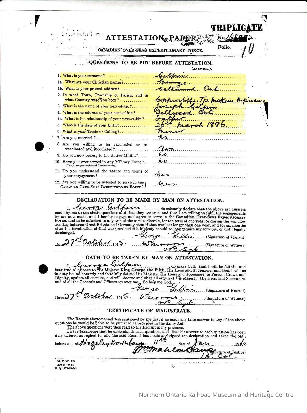 An attestation paper for George Gilpin of Sellwood for service in the First World War as a part of the Canadian Over-Seas Expeditionary Force.Notes