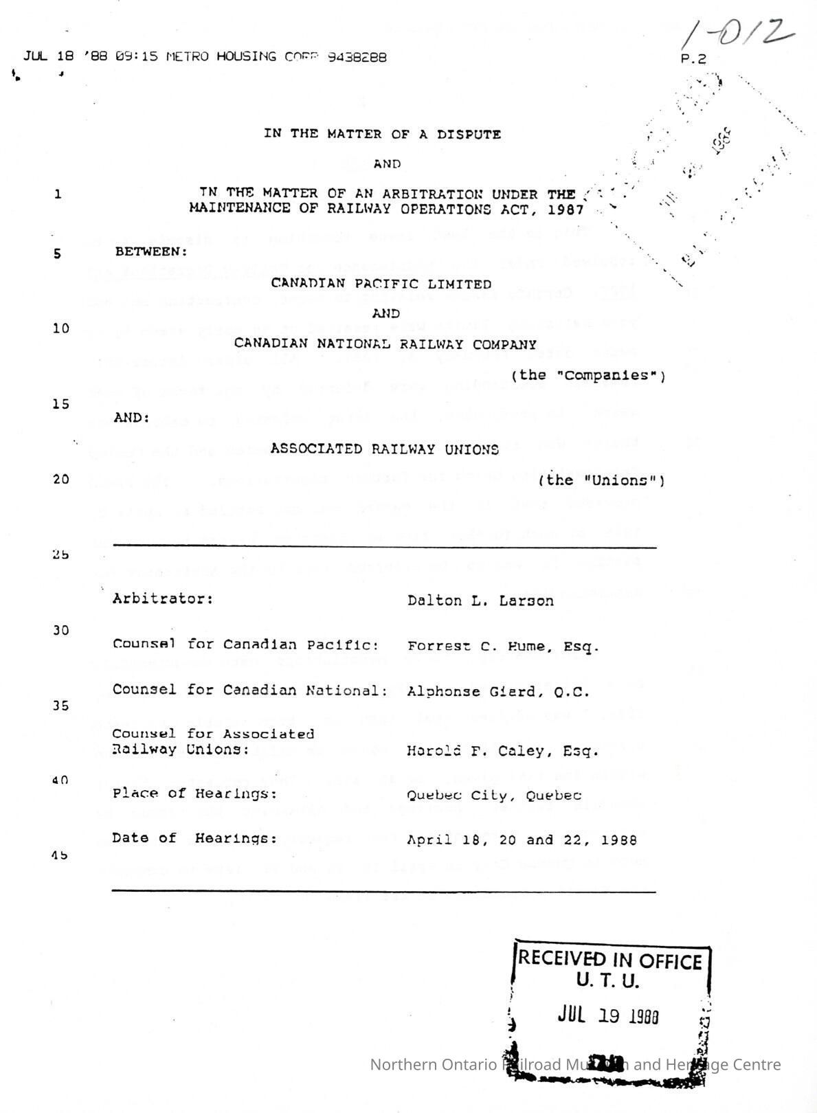 Document, In the Matter of a Dispute and In the Matter of an Arbitration under the Maintenance of Railway Operations Act, 1987, Between Canadian Pacific Limited and Canadian National Railway Companym and Associated Railway Unions.Collection