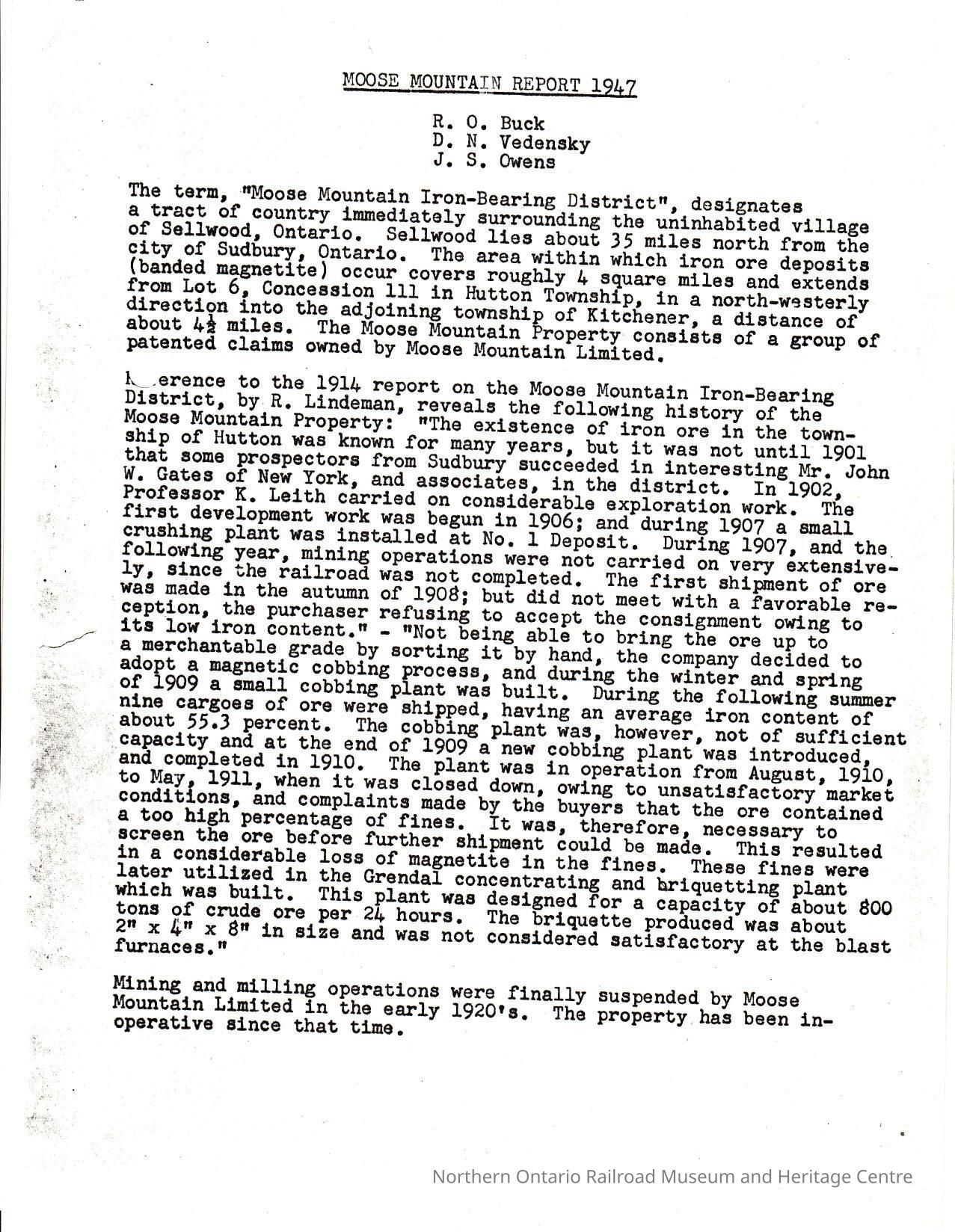 A report on the decline of the Moose Mountain Mine written by R.O Buck, D.N. Vedensky, and J.S. Owens.Creator