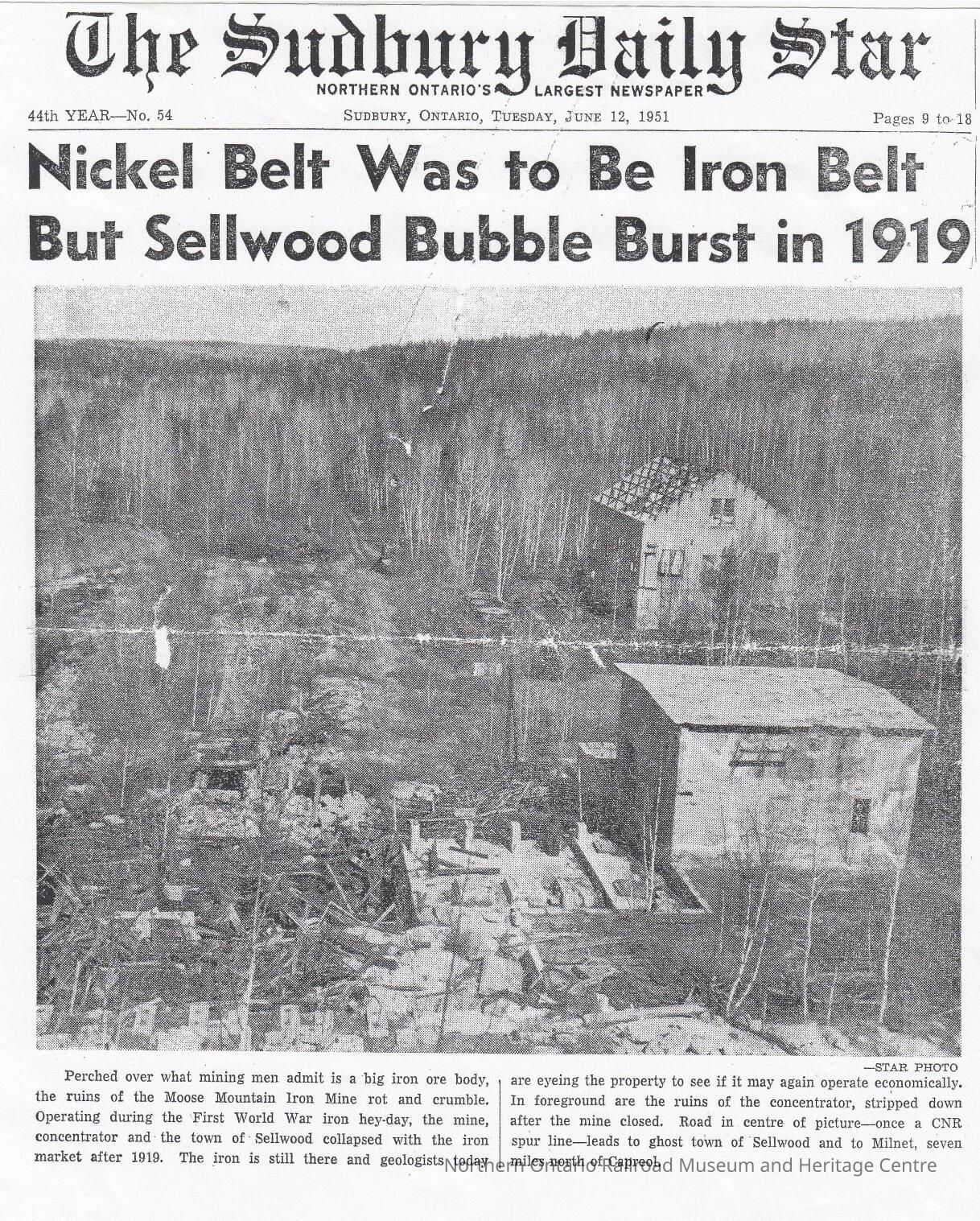 Document- "Nickel Belt Was to Be Iron Belt but Sellwood Bubble Burst in 1919."Collection