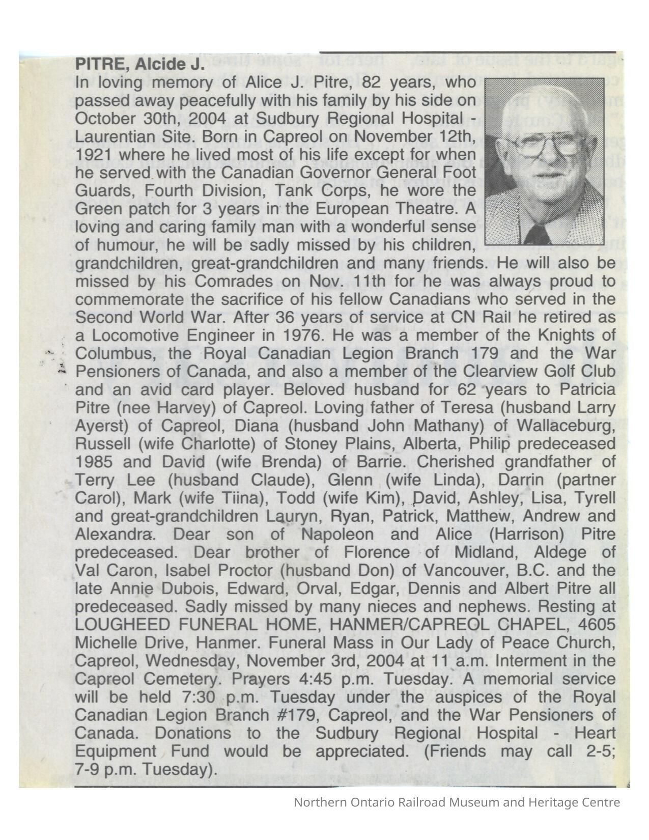 Document, Obituary, Alcide J. Pitre.Collection