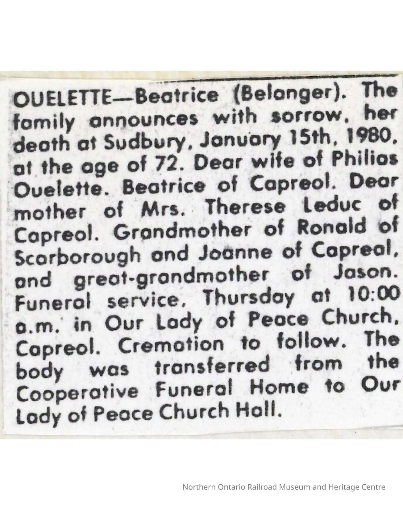 Document, Obituary, Beatrice Ouelette.Collection
