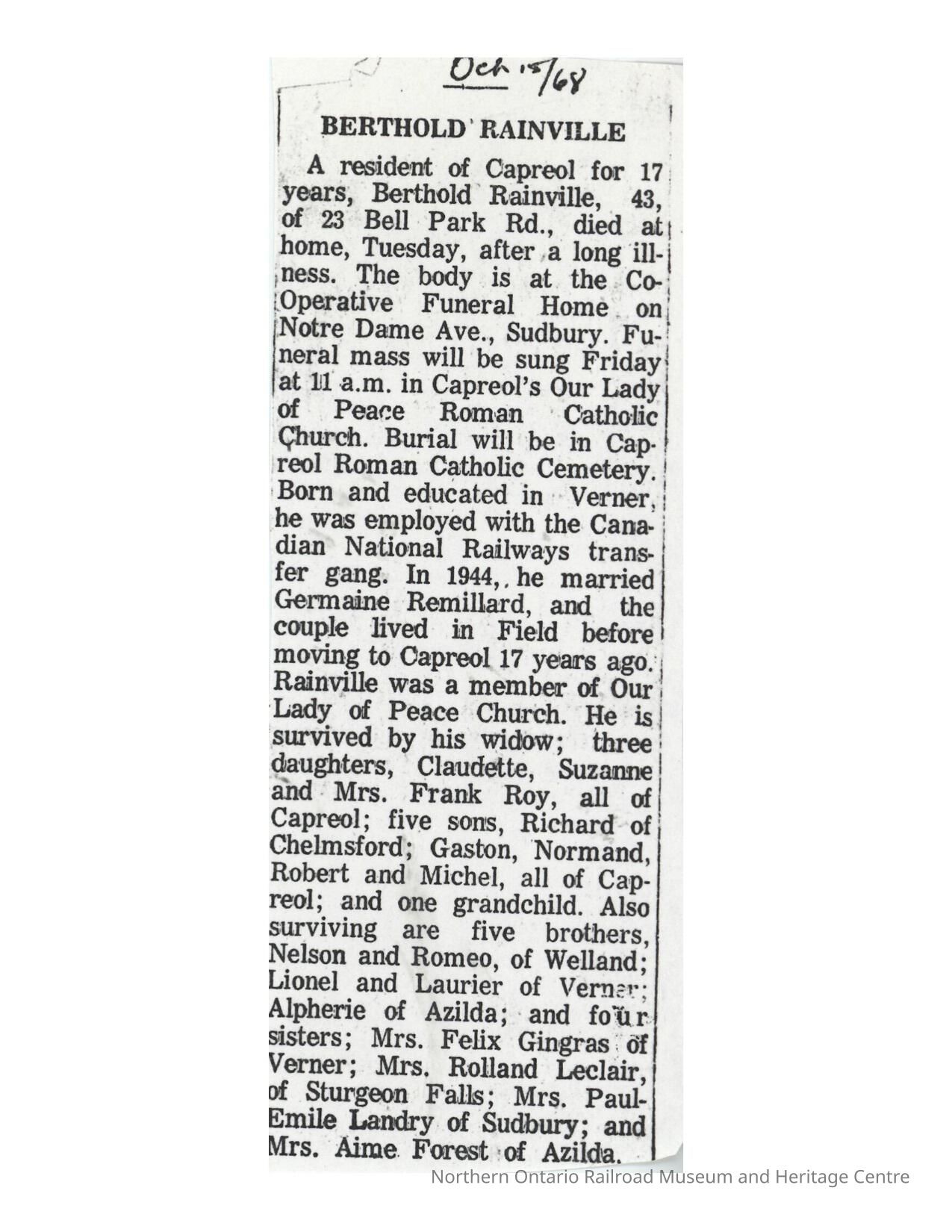 Document, Obituary, Berthold Rainville.Collection