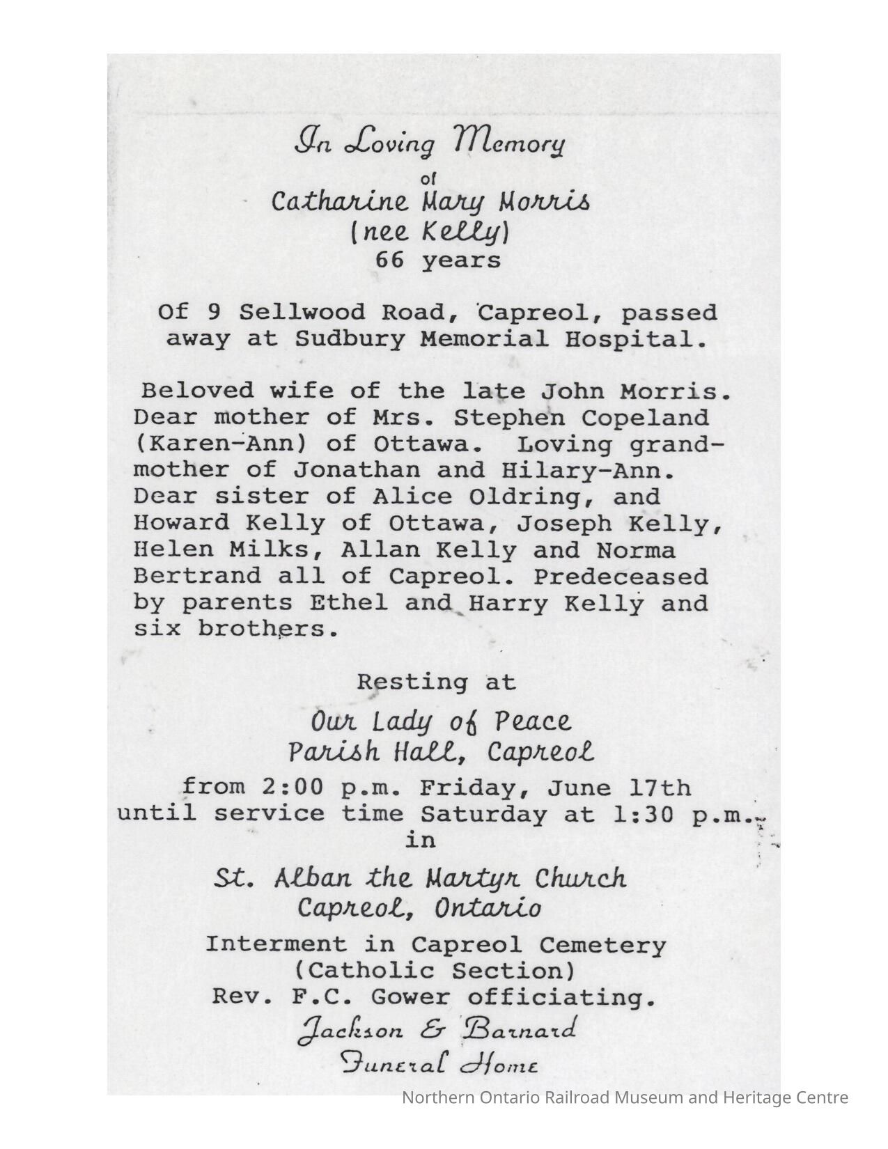 Document, Obituary, Catherine Mary Morris (nee Kelly).Collection
