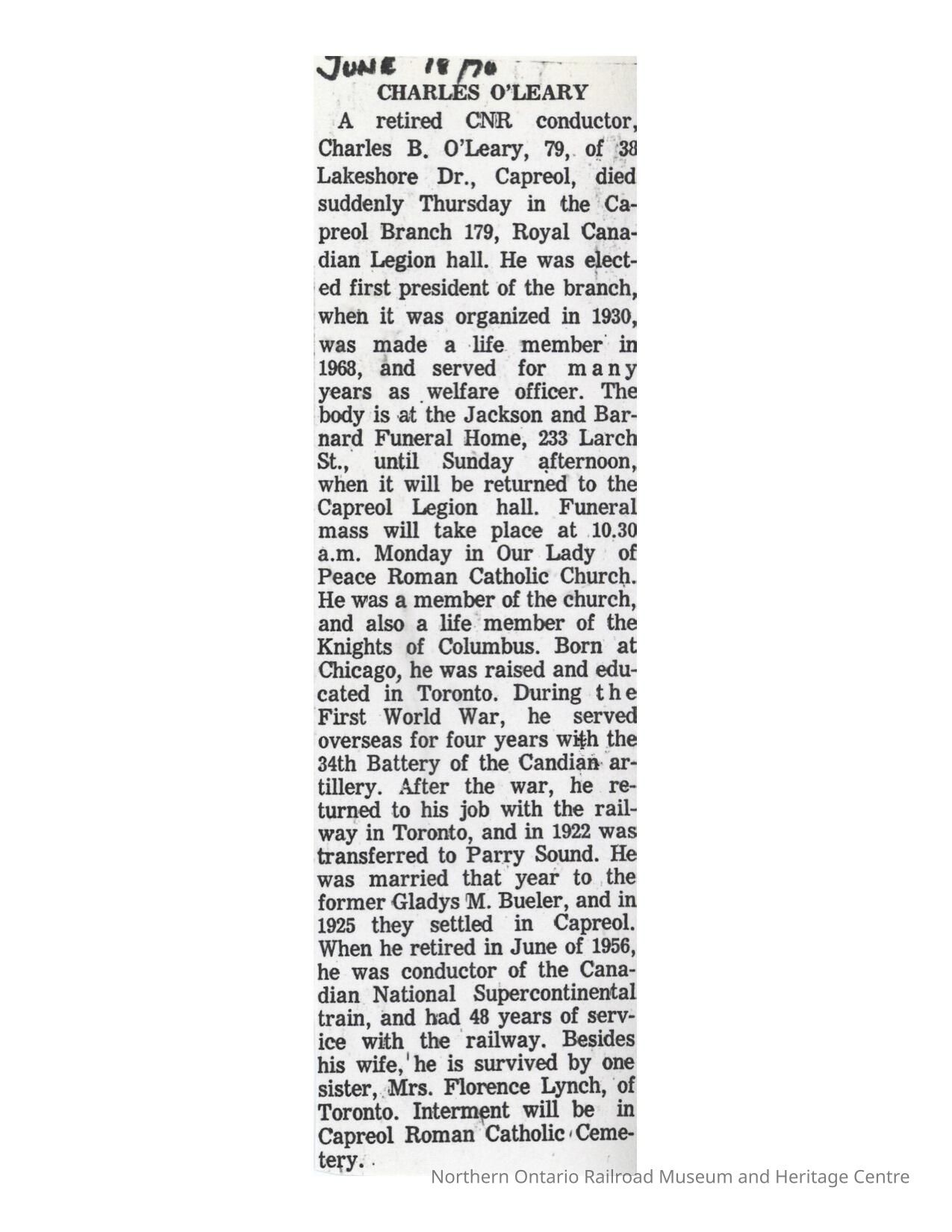 Document, Obituary, Charles O'Leary.Entry/Object ID