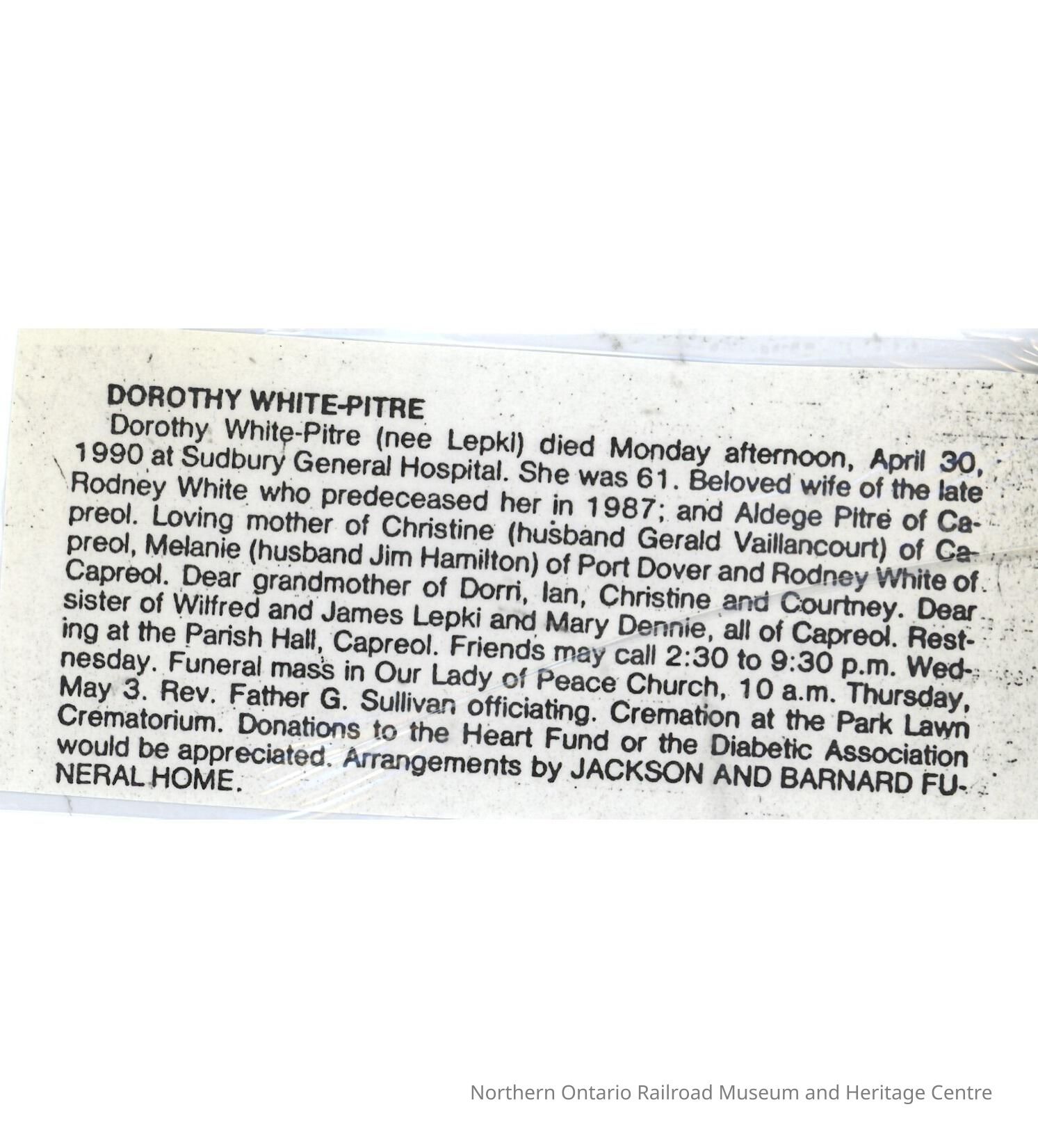 Document, Obituary, Dorothy White-Pitre.Collection