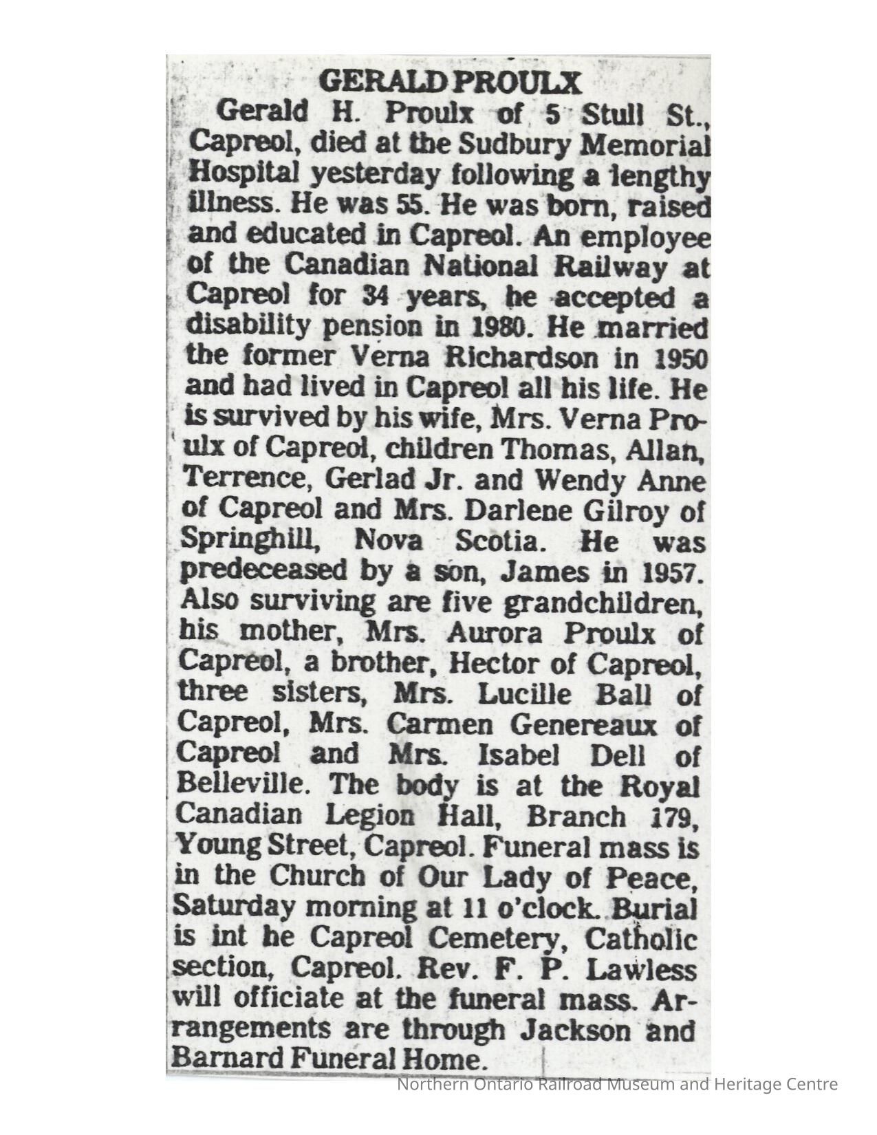 Document, Obituary, Gerald Proulx.Collection