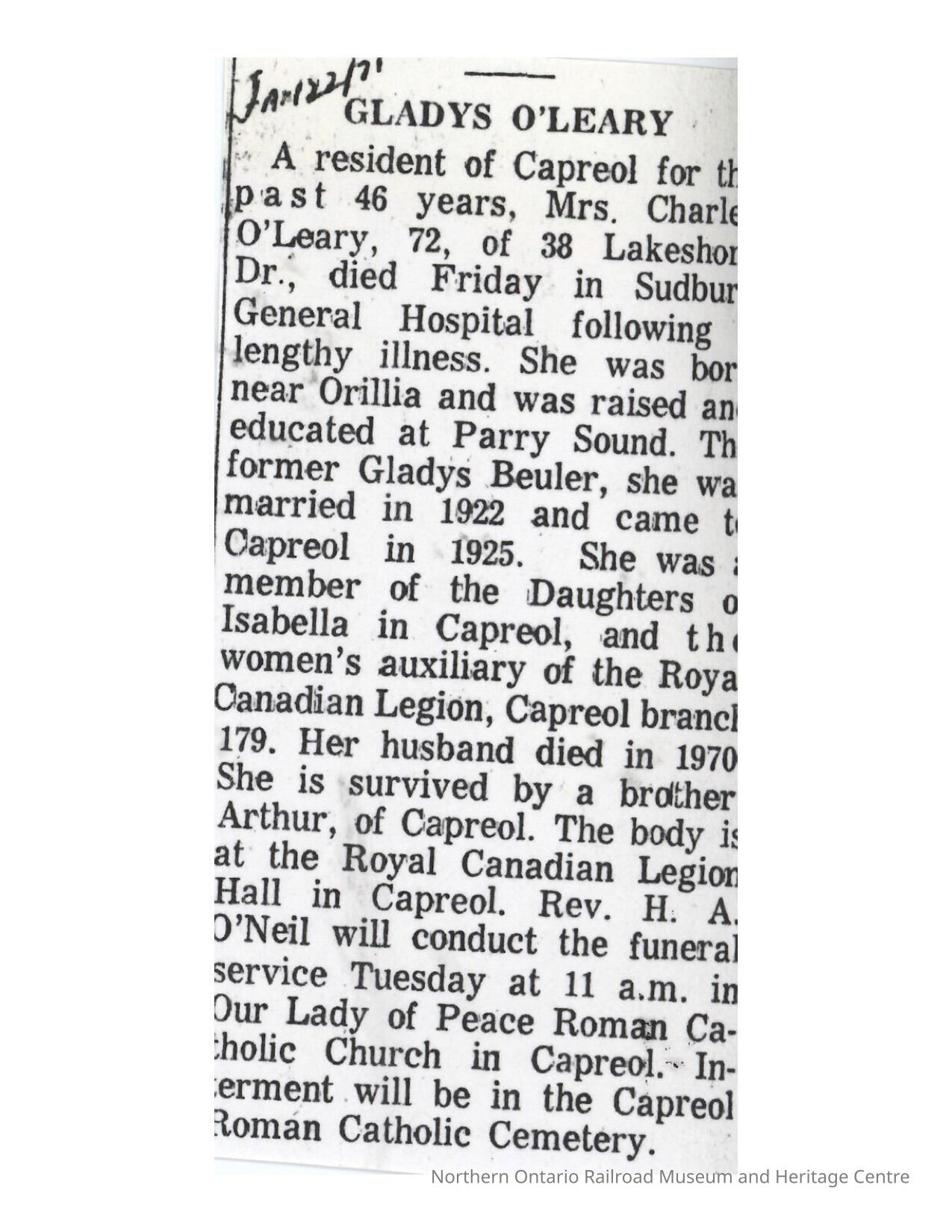 Document, Obituary, Gladys O'Leary.Collection