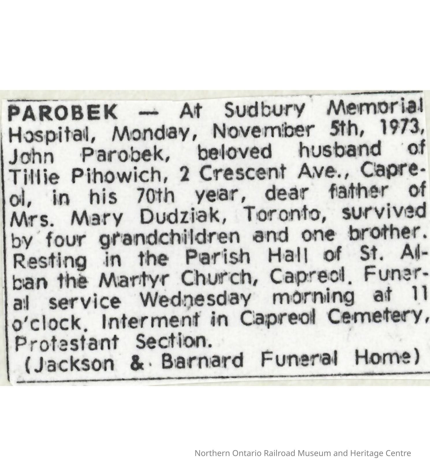 Document, Obituary, John Parobek.Collection