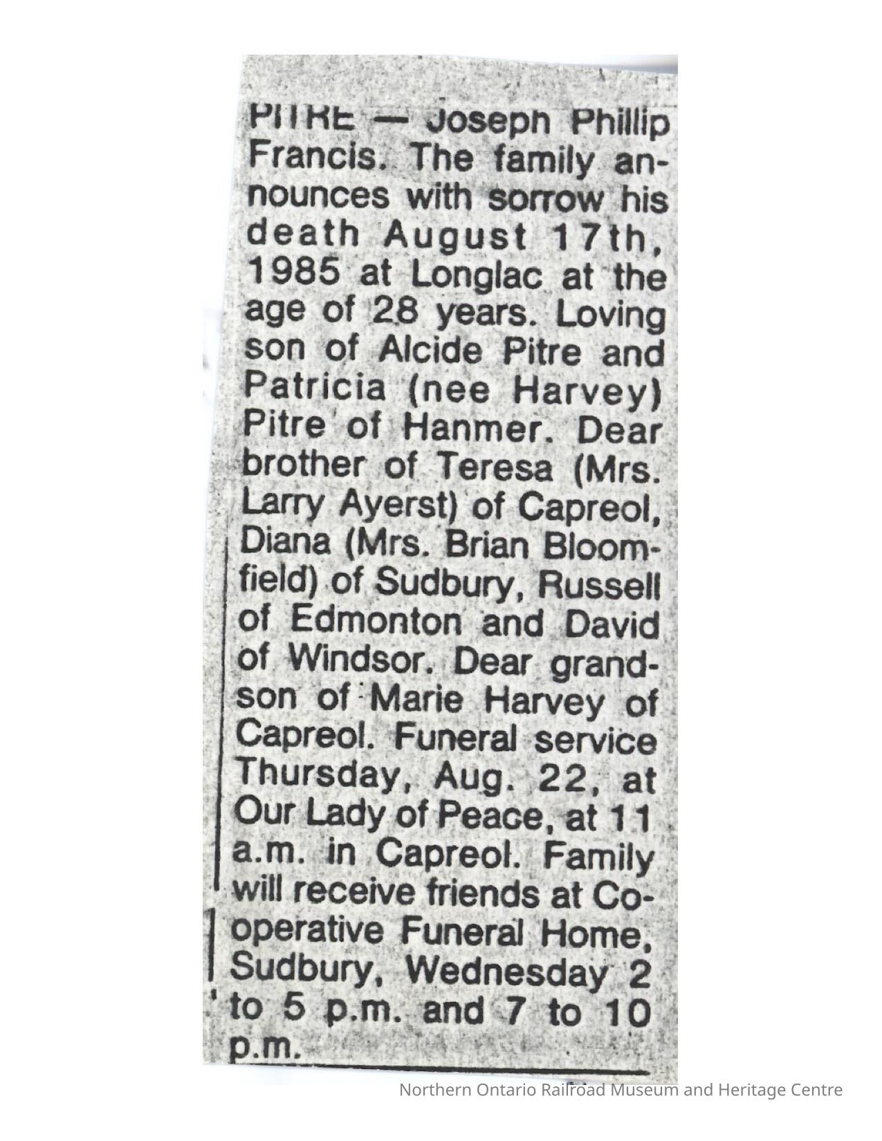 Document, Obituary, Joseph Phillip Pitre.Collection