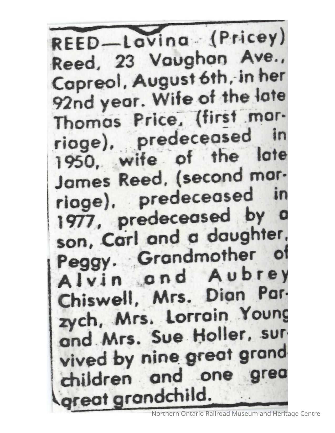 Document, Obituary, Lavina Reed.Collection