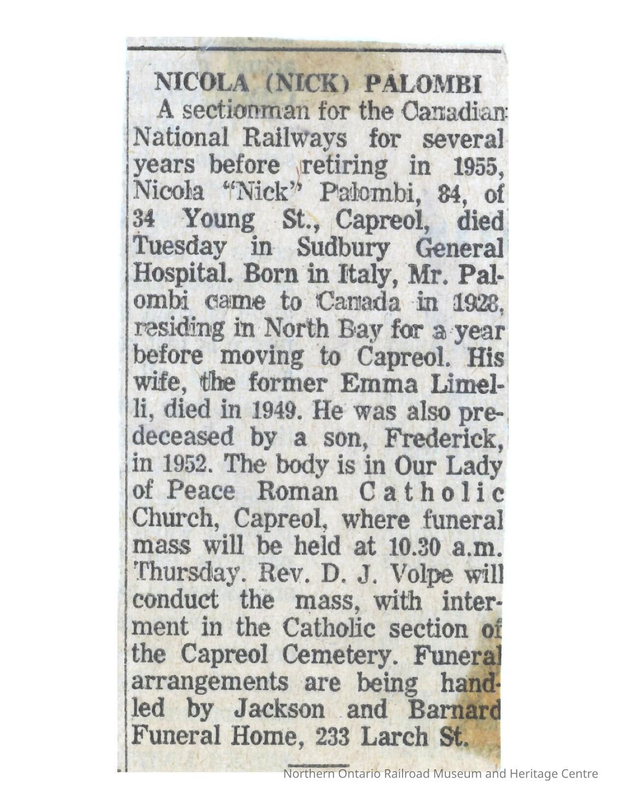 Document, Obituary, Nicola (Nick) Palombi.Collection