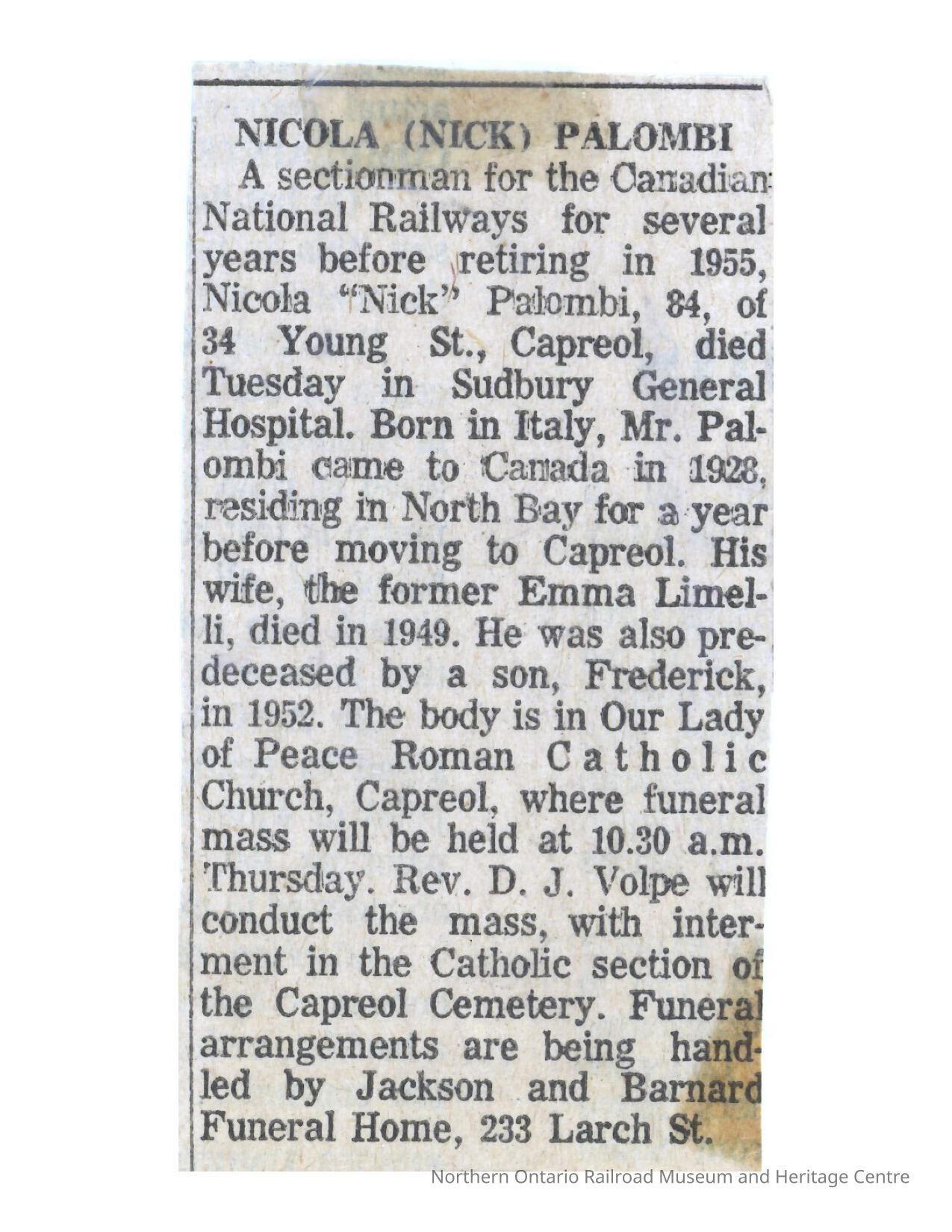 Document, Obituary, Nicola (Nick) Palombi.Collection
