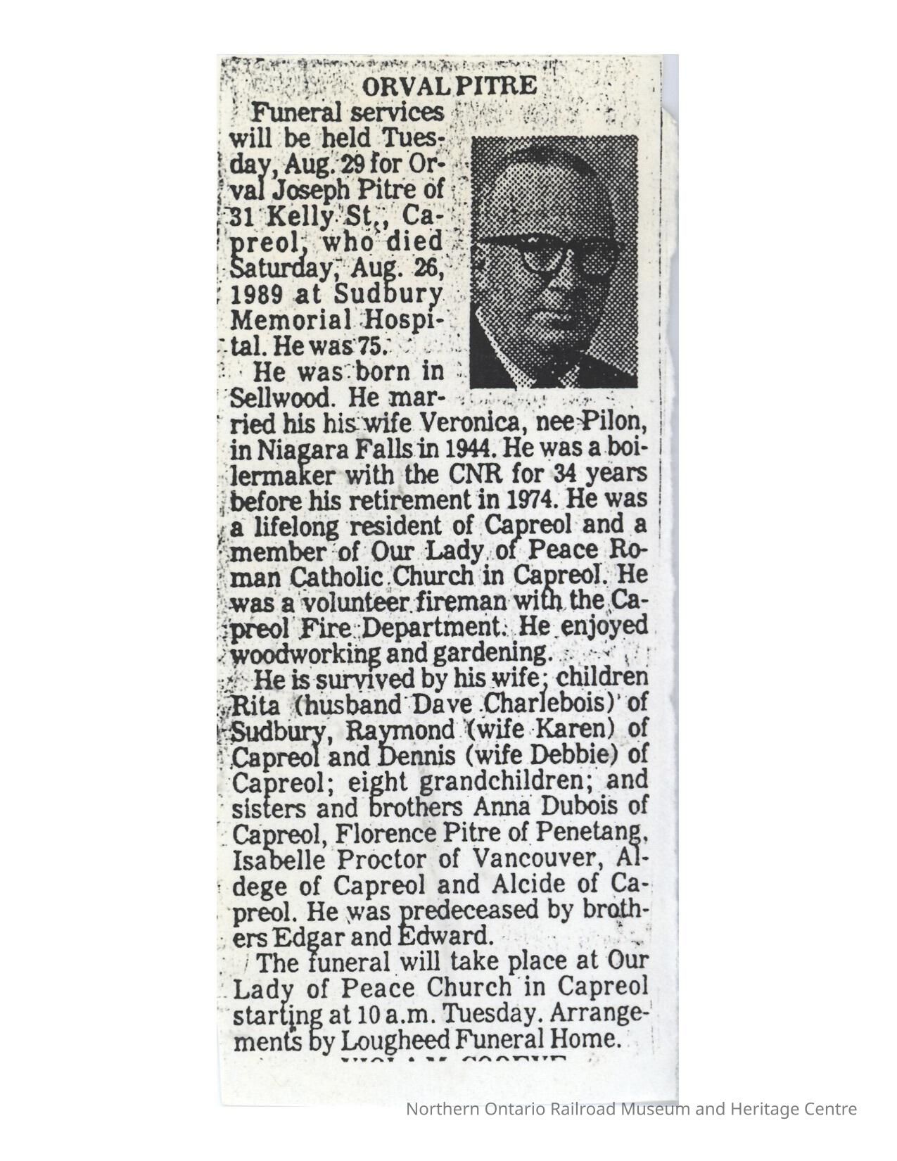 Document, Obituary, Orval Pitre.Collection