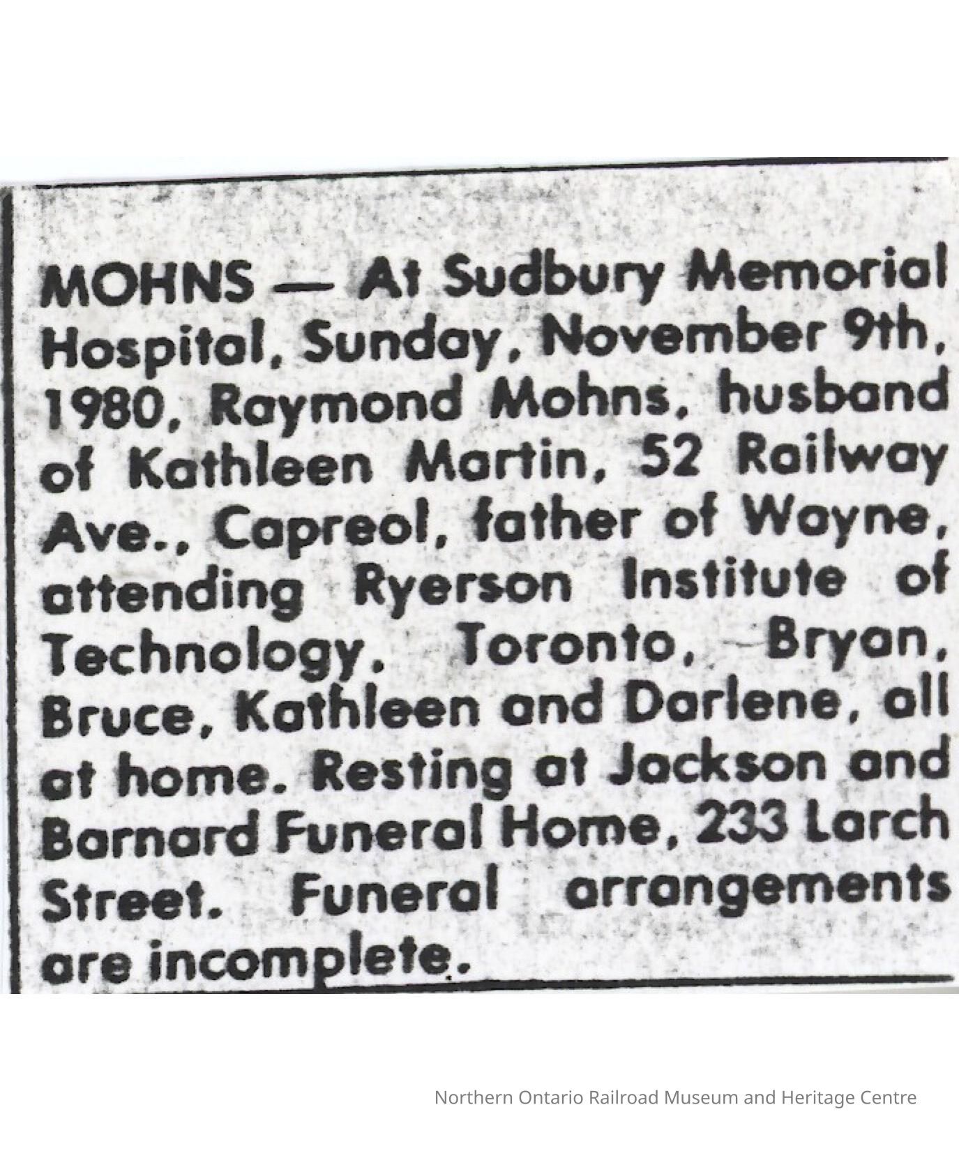 Document, Obituary, Raymond Mohns.Collection
