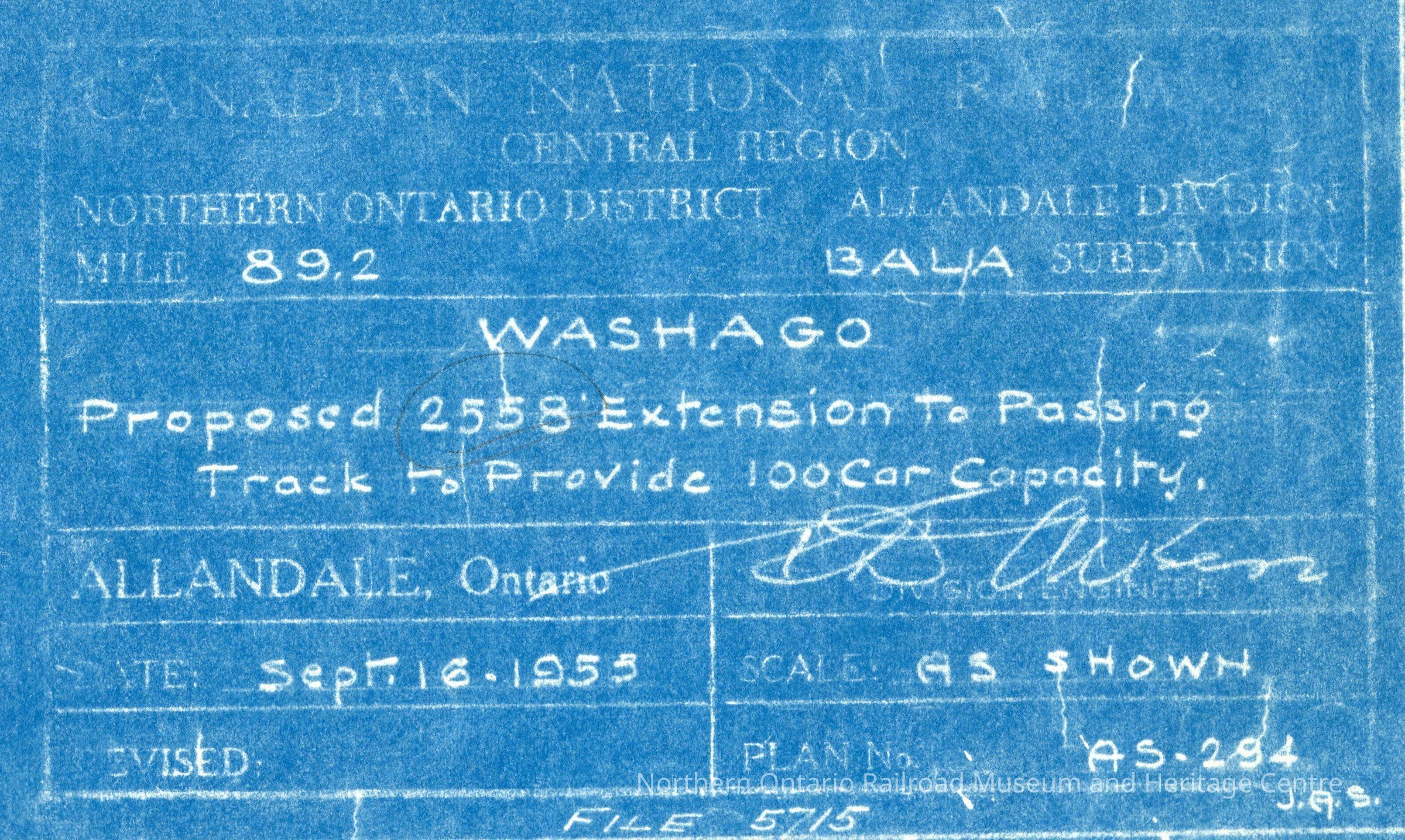 Document, Plan, Canadian National Railways, Central Region, Northern Ontario District, Allandale Division, Mile 89.2, Bala Subdivision, Washago Proposed 2558' Extension to Passing Track to provide 100 Car Capacity, Allandale, Ontario, September 16th, 1953.Collection