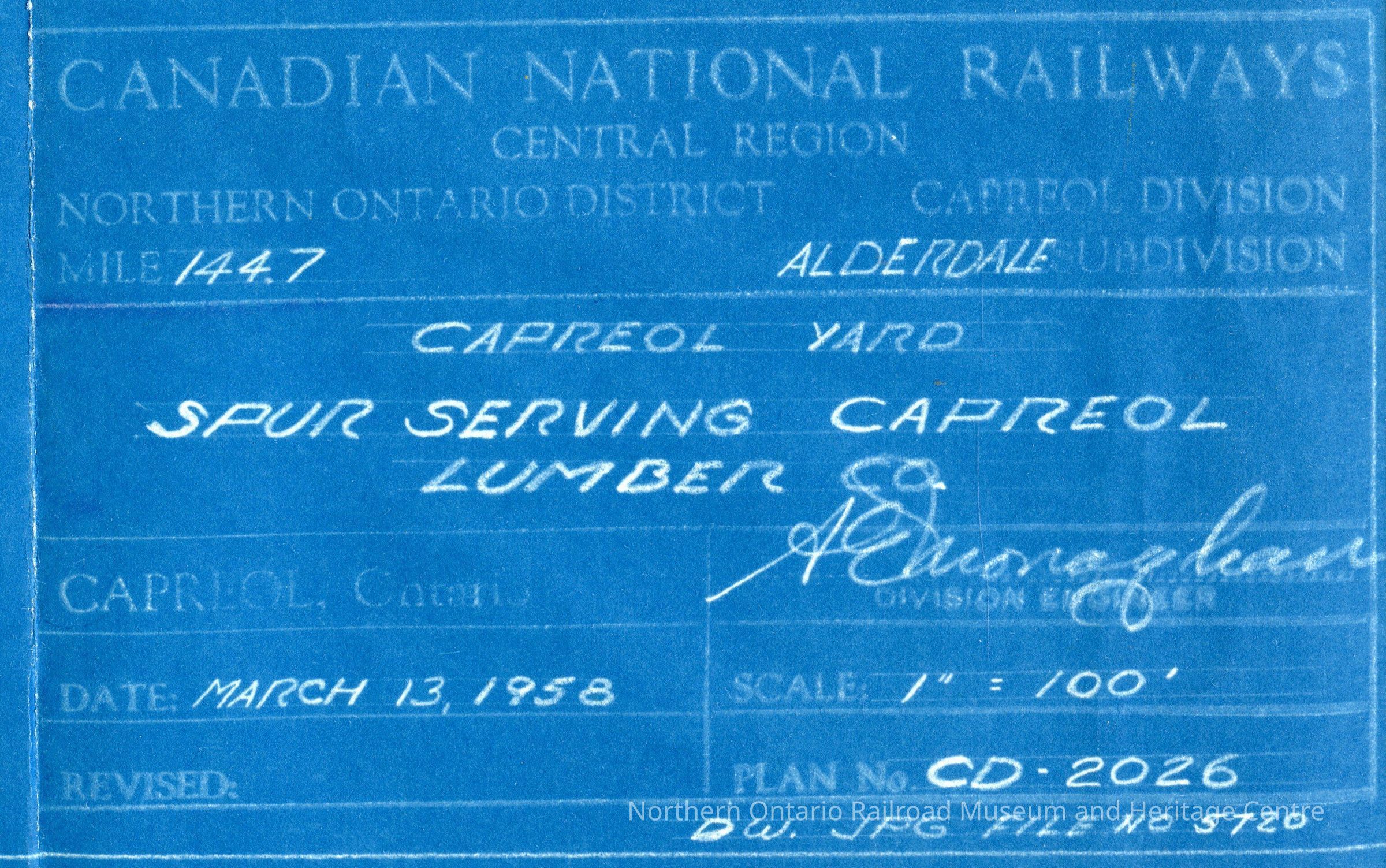 Document, Plan, Canadian National Railways, Central Region, Northern Ontario District, Capreol Division, Mile 144.7, Alderdale Subdivision, Capreol Yard Spur Serving Capreol Lumber Company, March 13th 1958.Collection