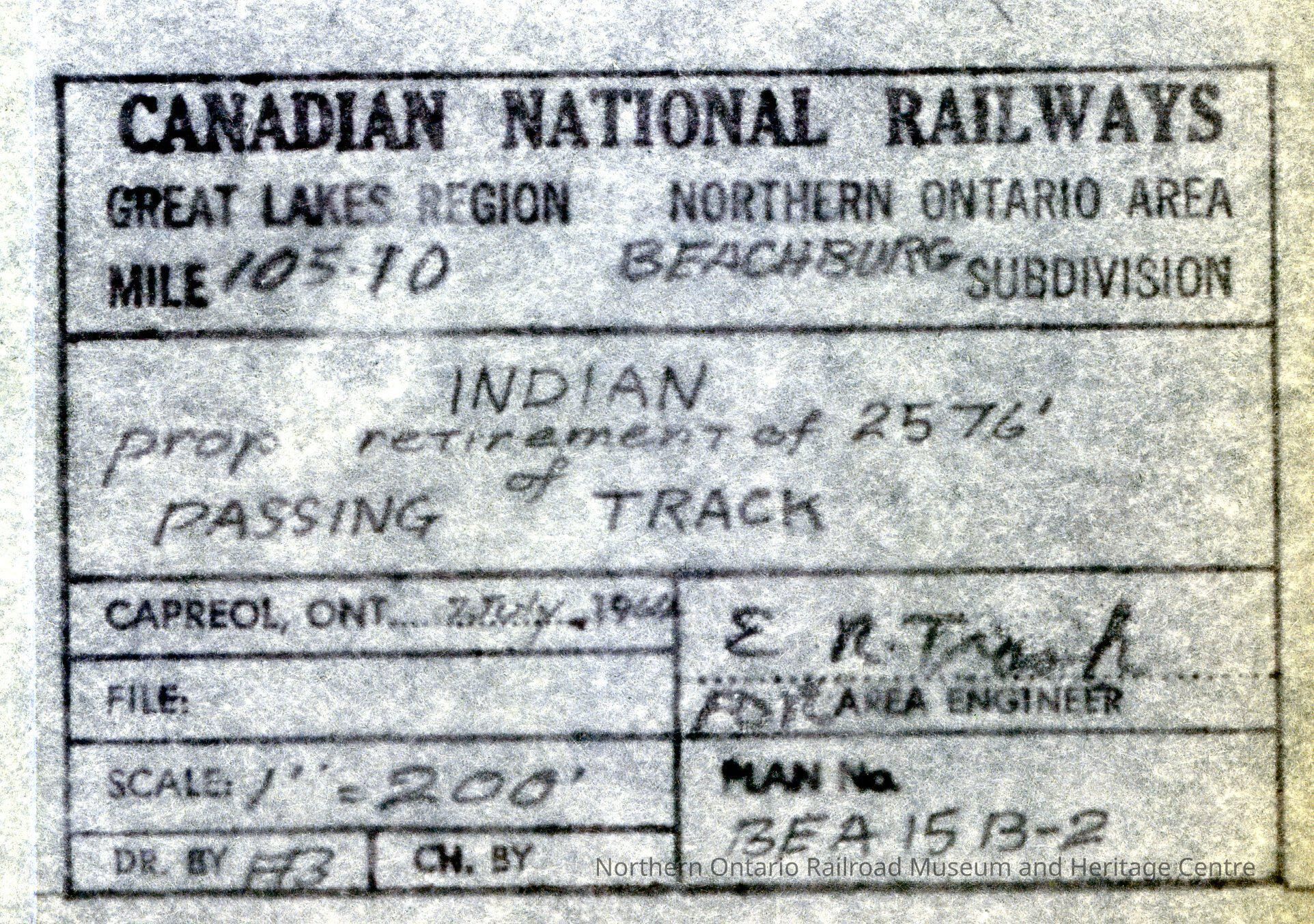 Document, Plan, Canadian National Railways, Great Lakes Region, Northern Ontario Area, Mile 105.10, Beachburg Subdivision, Indian, Proposed Retirement of 2576' of Passing Track.Collection