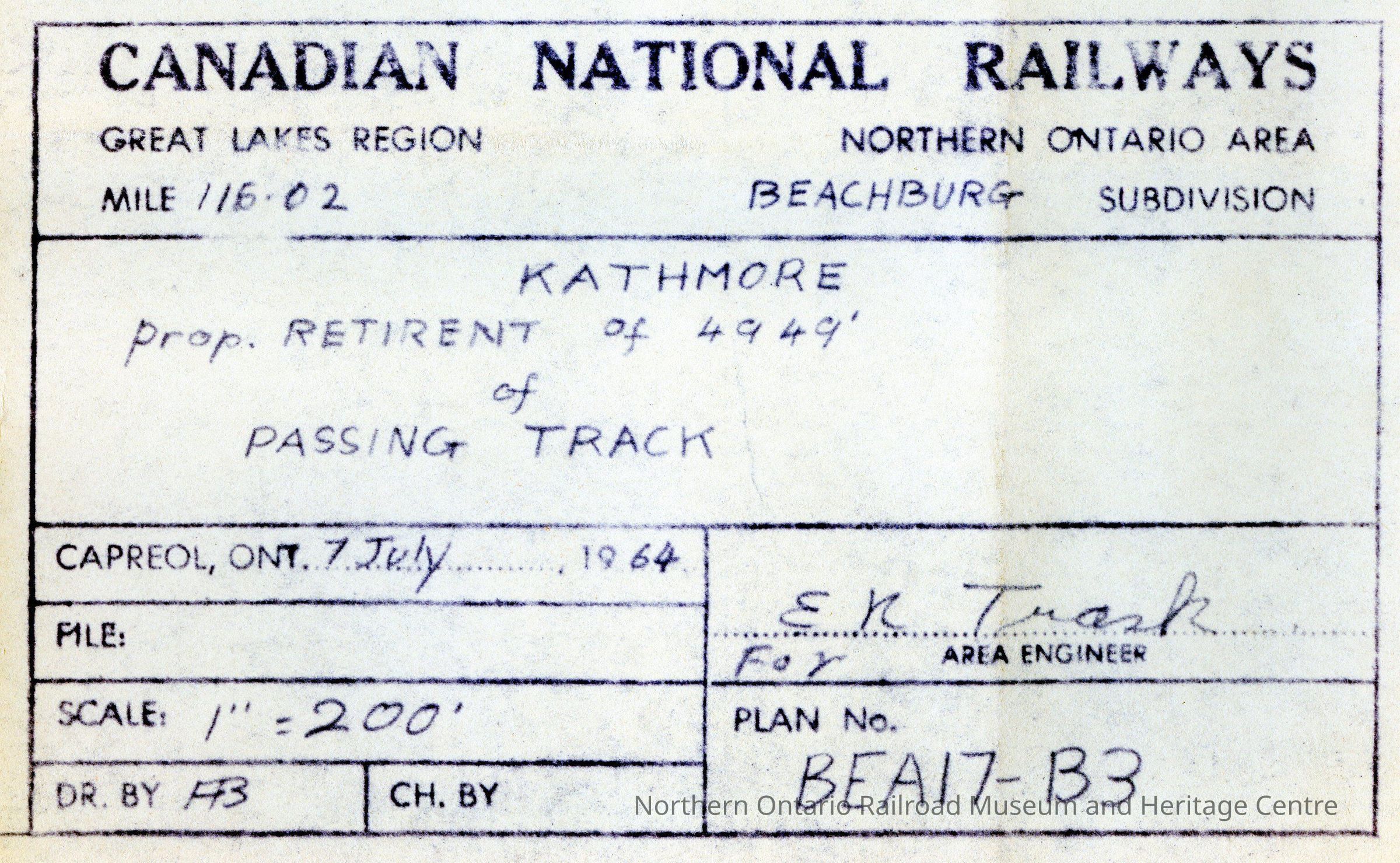Document, Plan, Canadian National Railways, Great Lakes Region, Northern Ontario Area, Mile 116.02, Beachburg Subdivision, Kathmore, Proposed Retirement of 4949' of Passing Track.Collection