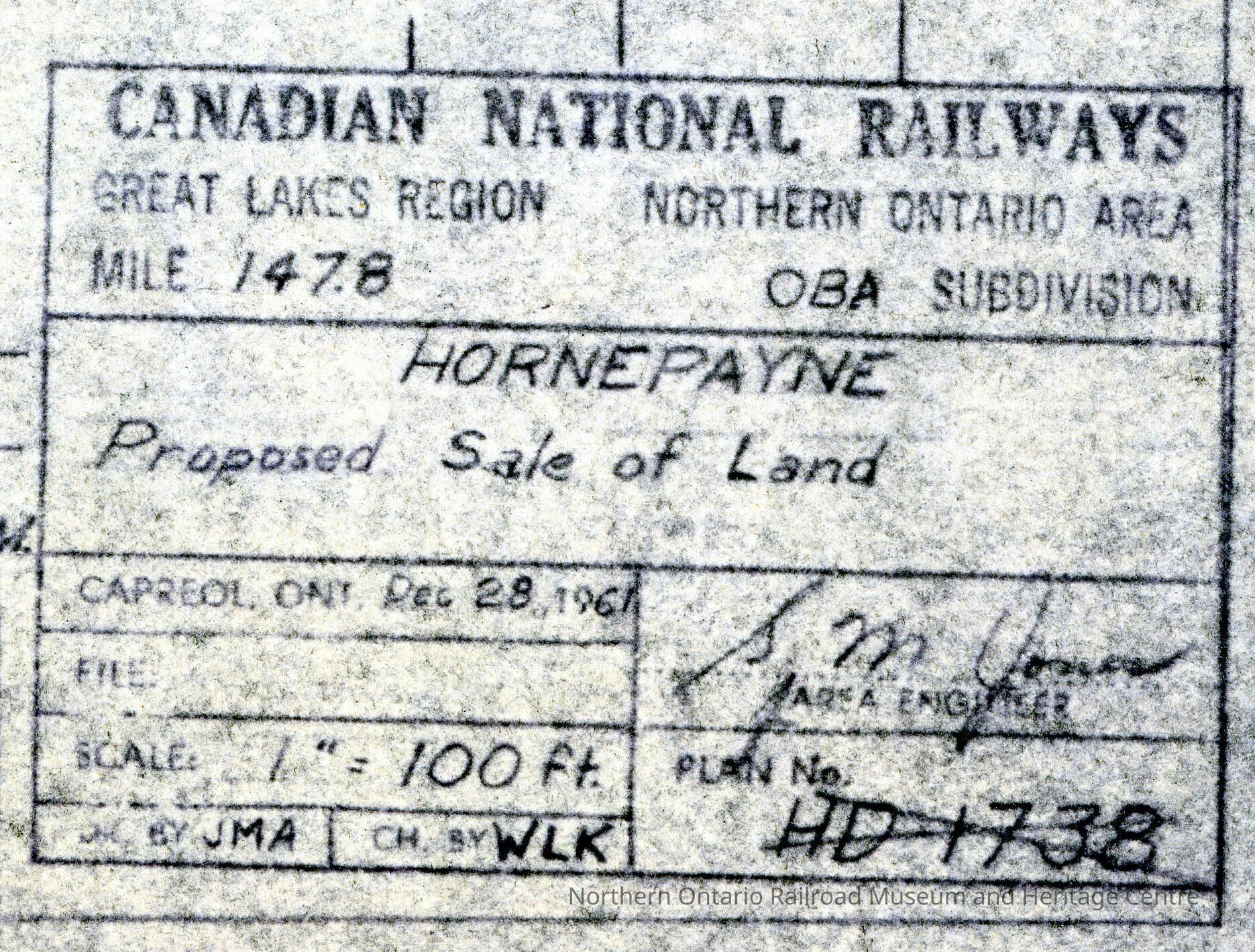 Document, Plan, Canadian National Railways, Great Lakes Region, Northern Ontario Area, Mile 147.8, Oba Subdivision, Hornepayne Proposed Sale of Land, December 28th 1961.Collection