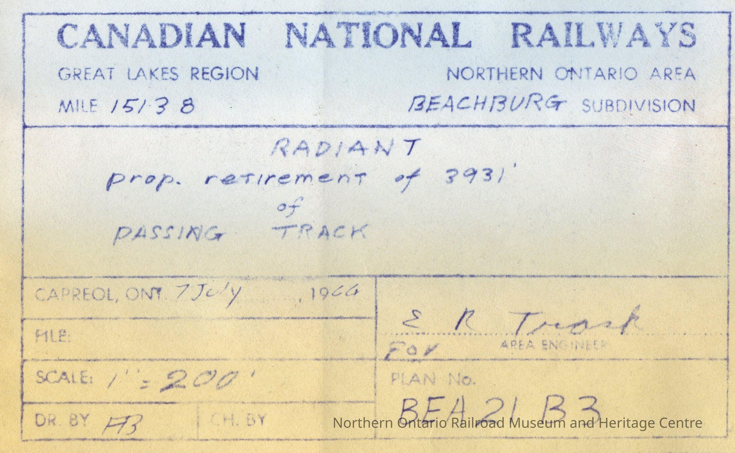 Document, Plan, Canadian National Railways, Great Lakes Region, Northern Ontario Area, Mile 151.38, Beachburg Subdivision, Radiant, Proposed Retirement of 3931 of Passing Track.Collection