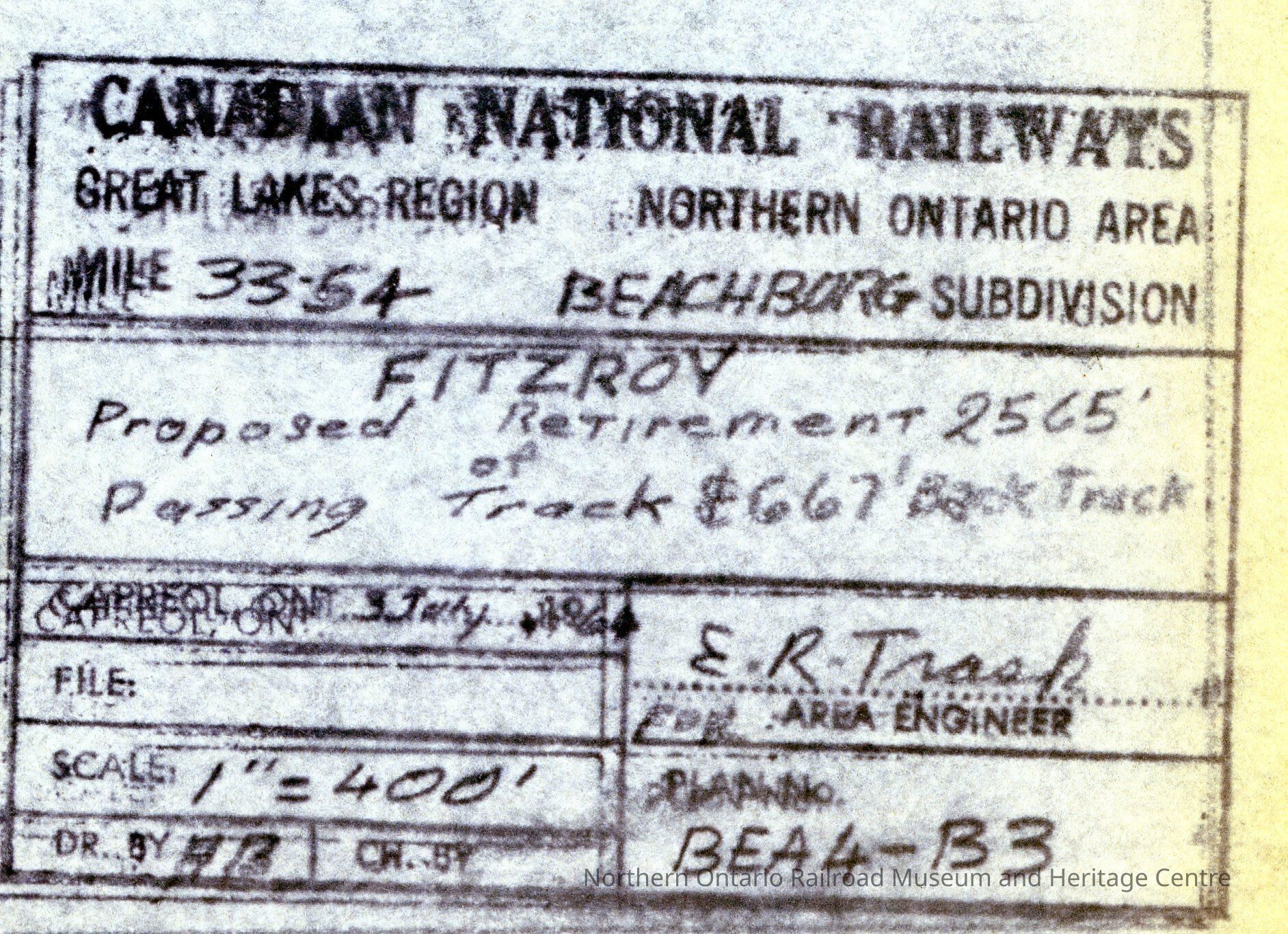 Document, Plan, Canadian National Railways, Great Lakes Region, Northern Ontario Area, Mile 335.4, Beachburg Subdivision, Fitzroy, Proposed Retirement 2565' of Passing Track & 667' Back Track.Collection