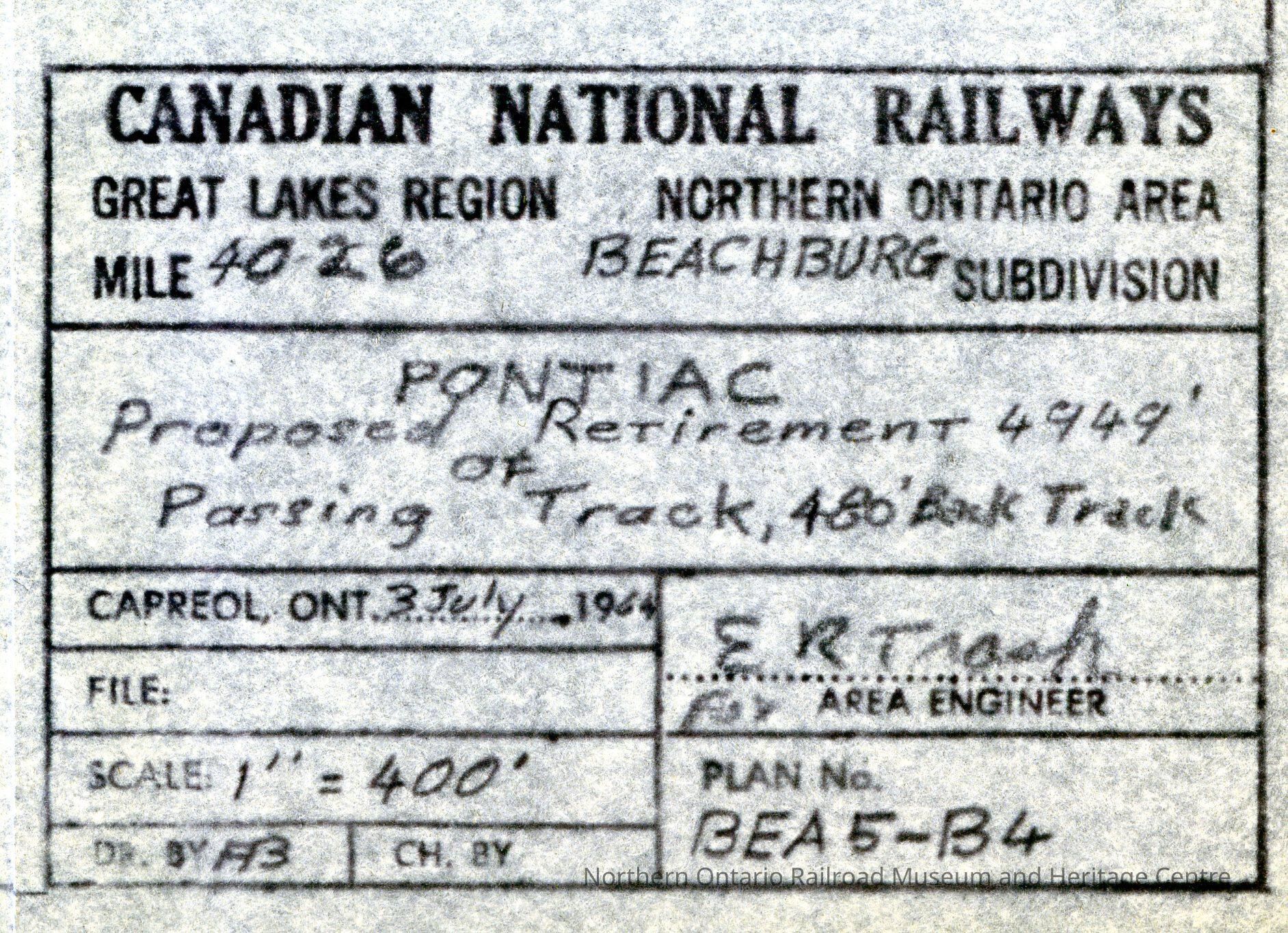 Document, Plan, Canadian National Railways, Great Lakes Region, Northern Ontario Area, Mile 402.6, Beachburg Subdivision, Pontiac, Proposed Retirement 4949' of Passing Track, 480' Back Track.Collection