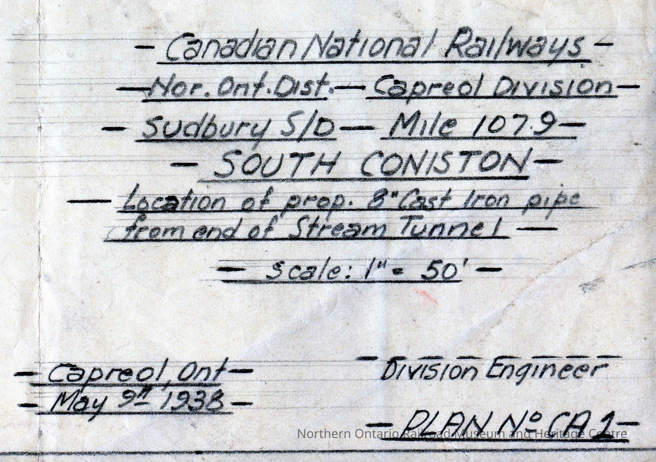Document, Plan, Canadian National Railways, Northern Ontario District, Capreol Division, Sudbury Subdivision, Mile 107.9, South Coniston, Location of Proposed 8" Cast Iron Pipe from end of Stream Tunnel, May 9th 1938.Collection