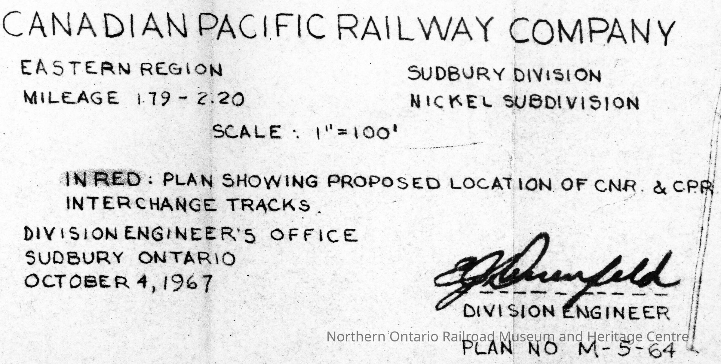 Document, Plan, Canadian Pacific Railway Company, Eastern Region, Sudbury Division, Mileage 1.79-2.20, Nickel Subdivision, Plan Showing proposed location of CNR & CPR interchange tracks, October 4th 1967.Collection
