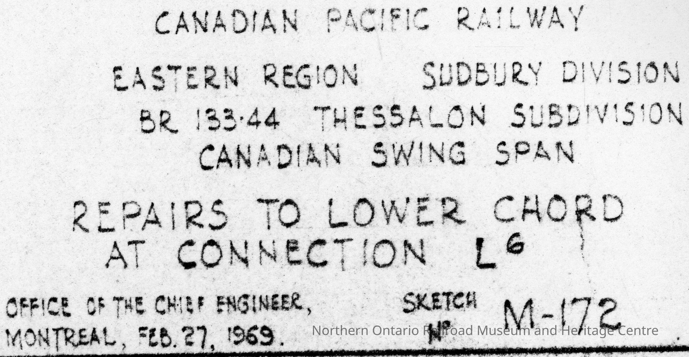 Document, Plan, Canadian Pacific Railway, Eastern Region, Sudbury Division, BR 133.44, Thessalon Subdivision, Canadian Swing Span, Repairs to Lower Chord at Connection L6, Montreal, February 27th 1969.Collection