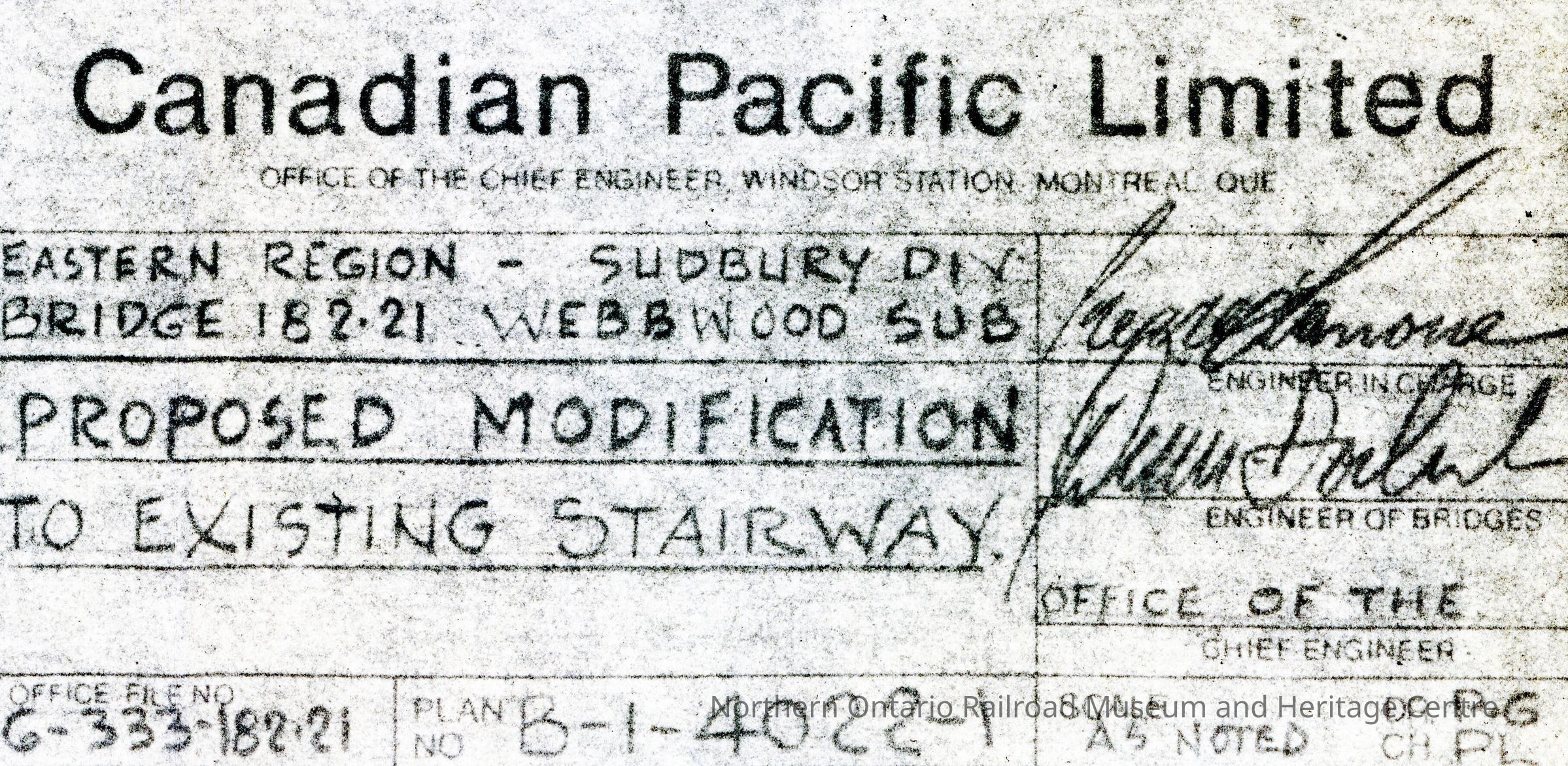 Document, Plan, Canadian Pacific Railway, Eastern Region, Sudbury Division, Bridge 182.21, Webbwood Subdivision, Proposed Modification to Existing Stairway.Collection