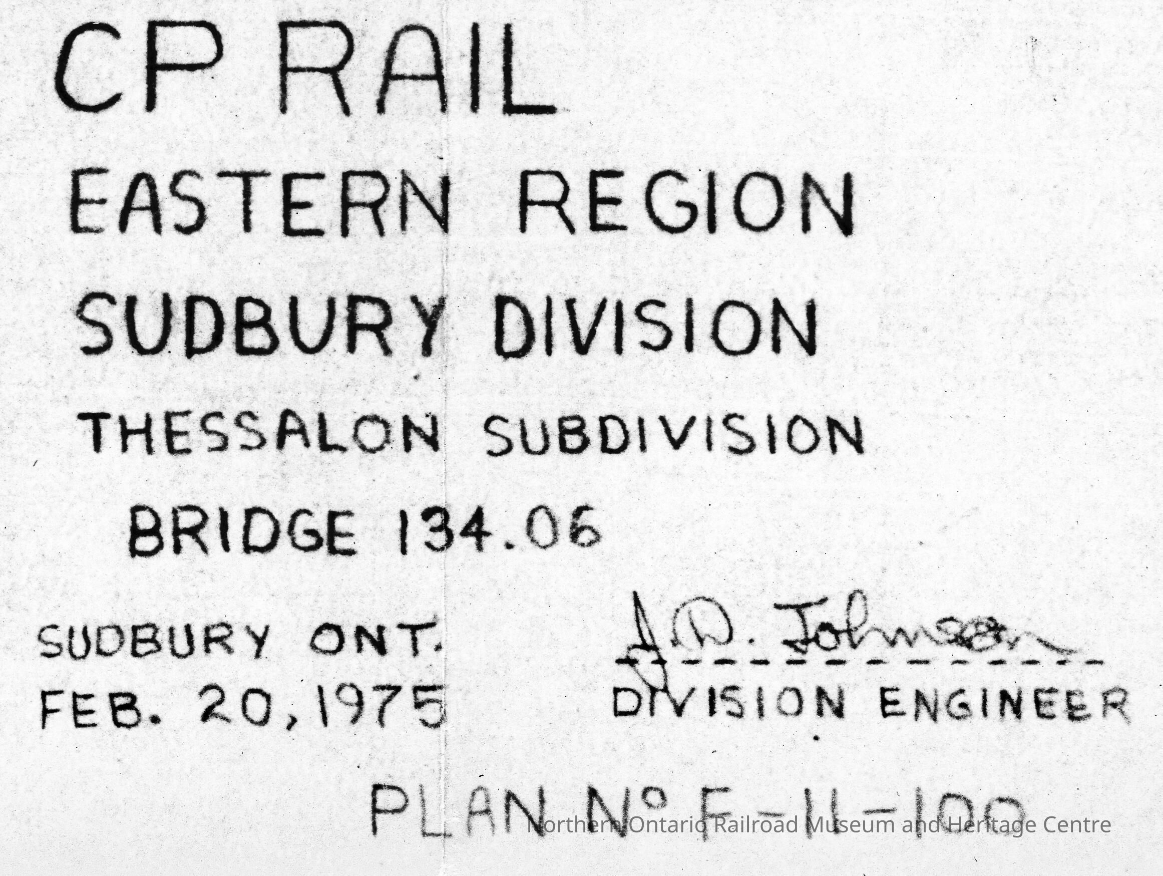Document, Plan, Canadian Pacific Railway, Eastern Region, Sudbury Division, Thessalon Subdivision, Bridge 134.06, February 20th 1975.Collection