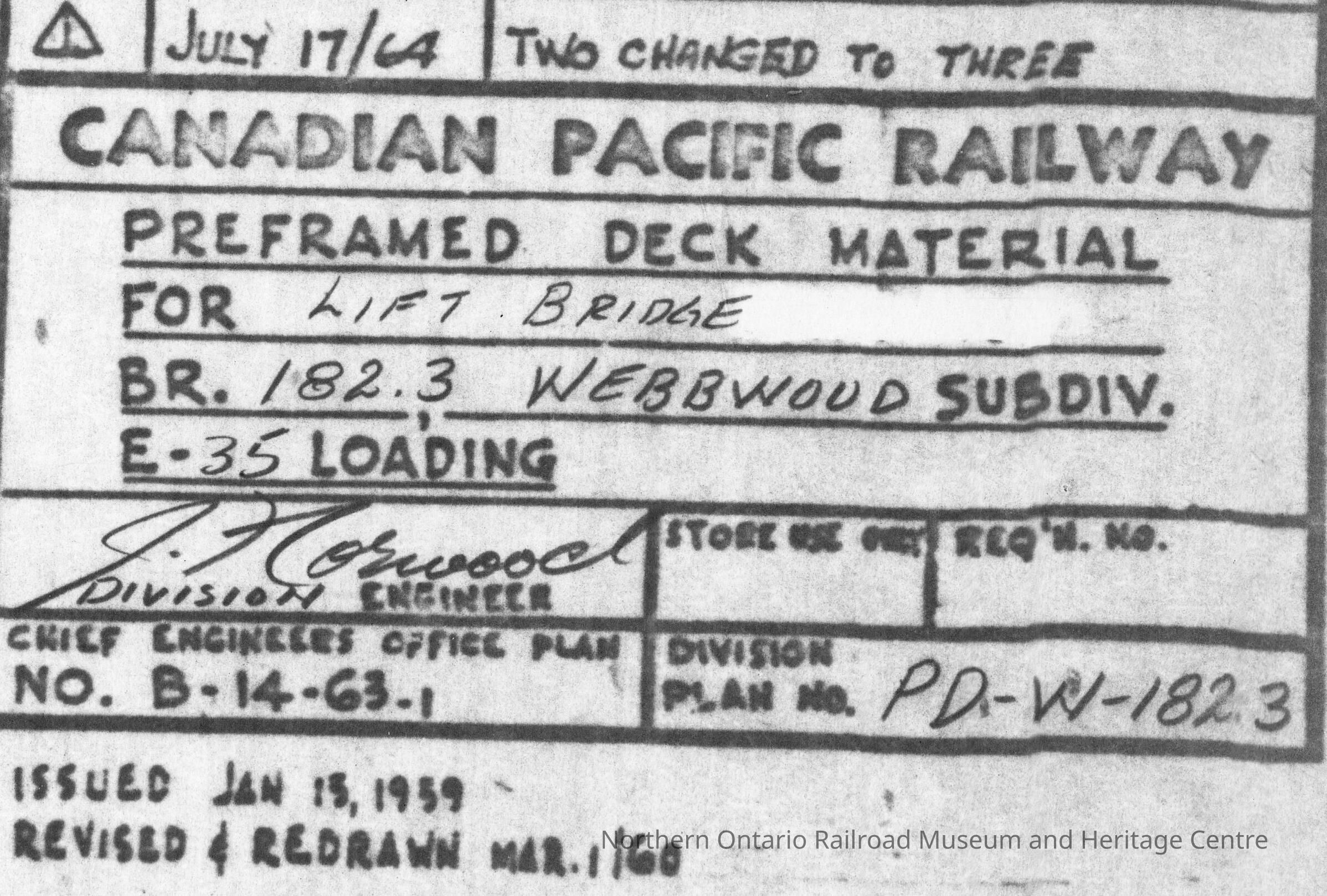 Document, Plan, Canadian Pacific Railway, Preframed Deck Material for Lift Bridge, Bridge 182.3, Webbwood Subdivision, E-35 Loading, January 15th 1959.Collection