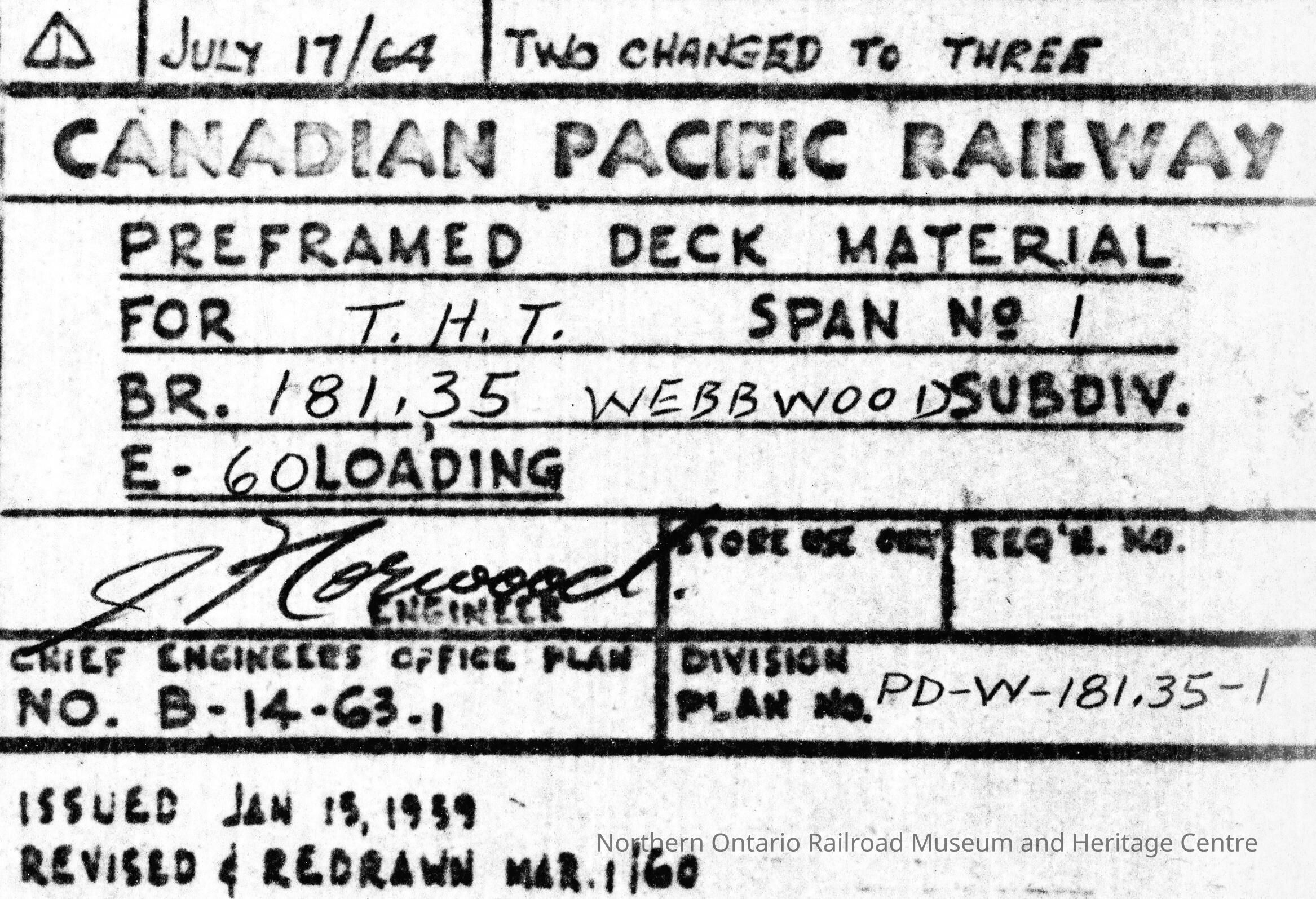 Document, Plan, Canadian Pacific Railway, Preframed Deck Material for T.H.T. Webbwood Subdivision, January 15th 1959.Collection