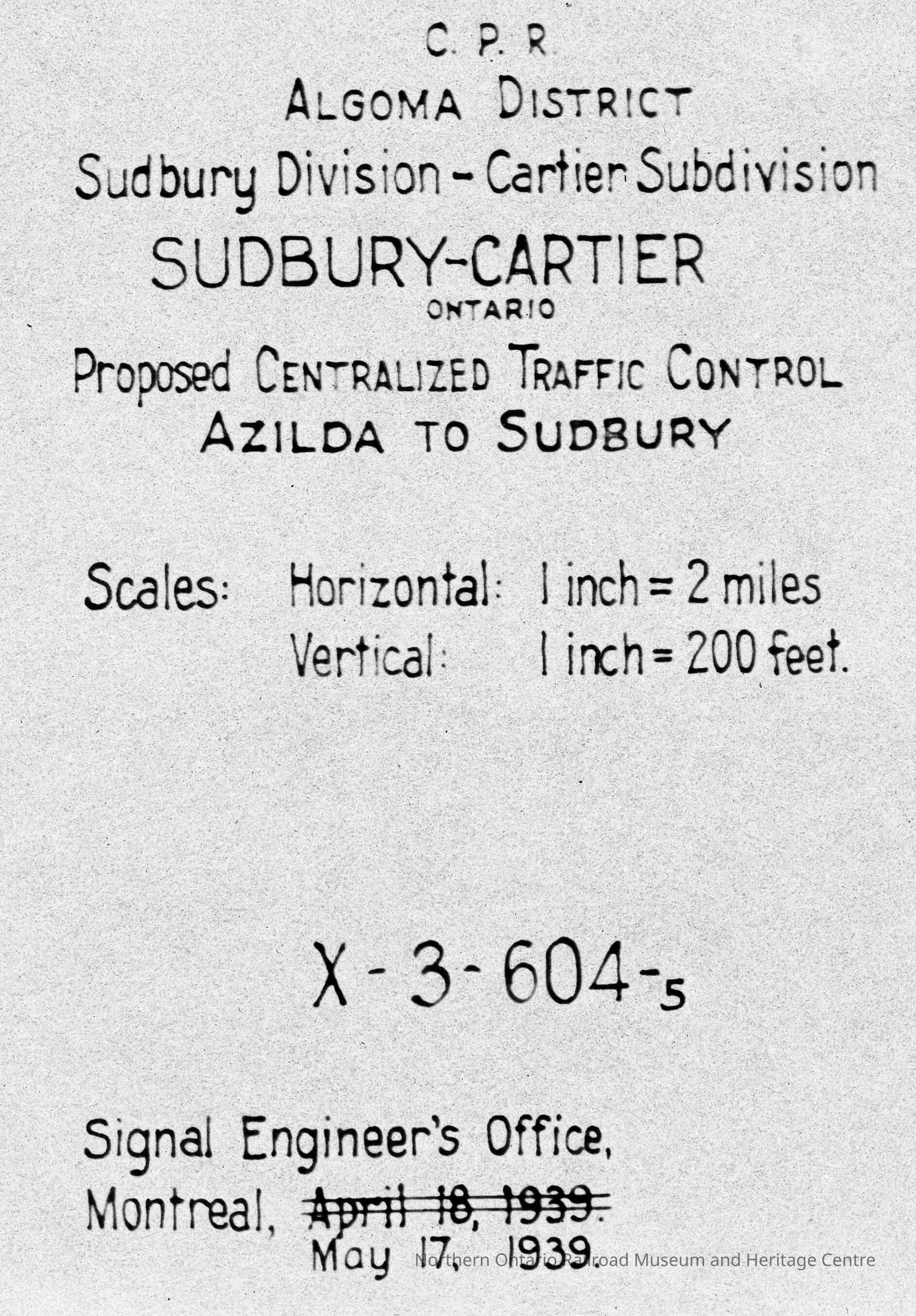 Document, Plan, Canadian Pacific Railways, Algoma District, Sudbury Division-Cartier Subdivision, Sudbury-Cartier Ontario, Proposed Centralized Traffic Control, Azilda to Sudbury, May 17th 1939.Collection