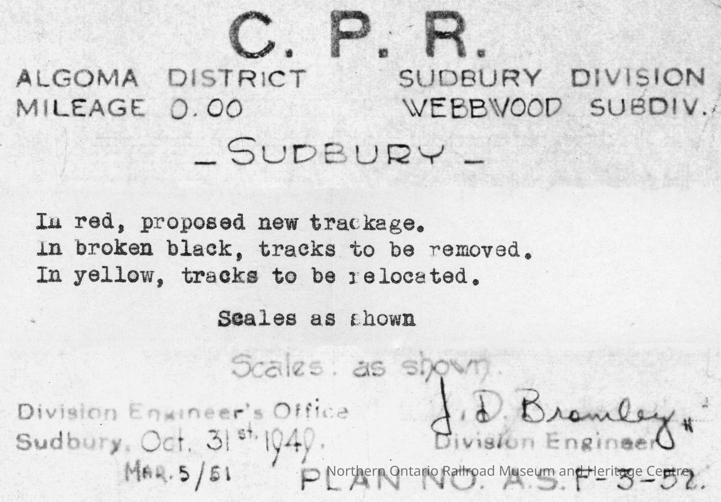 Document, Plan, Canadian Pacific Railways, Algoma District, Sudbury Division, Mileage 0.00, Webbwood Subdivision, Proposed new trackage, tracks to be removed, tracks to be relocated, October 31st 1949.Collection