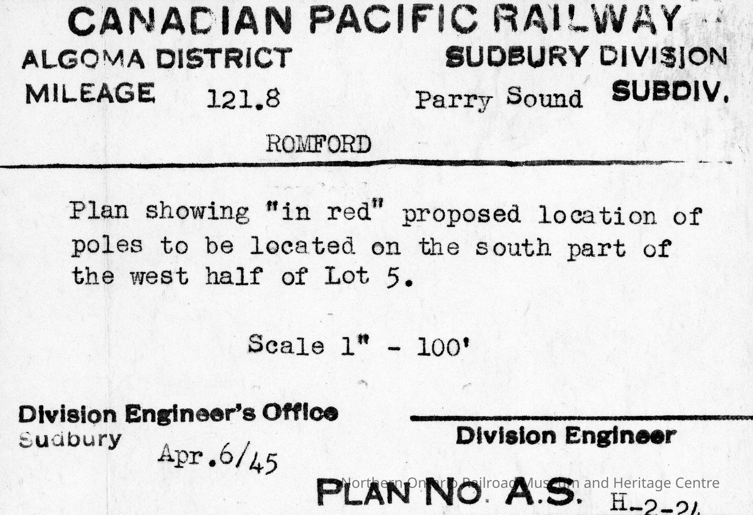 Document, Plan, Canadian Pacific Railways, Algoma District, Sudbury Division,Parry Sound Subdivision, Romford Ontario, Plan showing proposed location of poles to be located on the south part of the west half of Lot 5.Collection