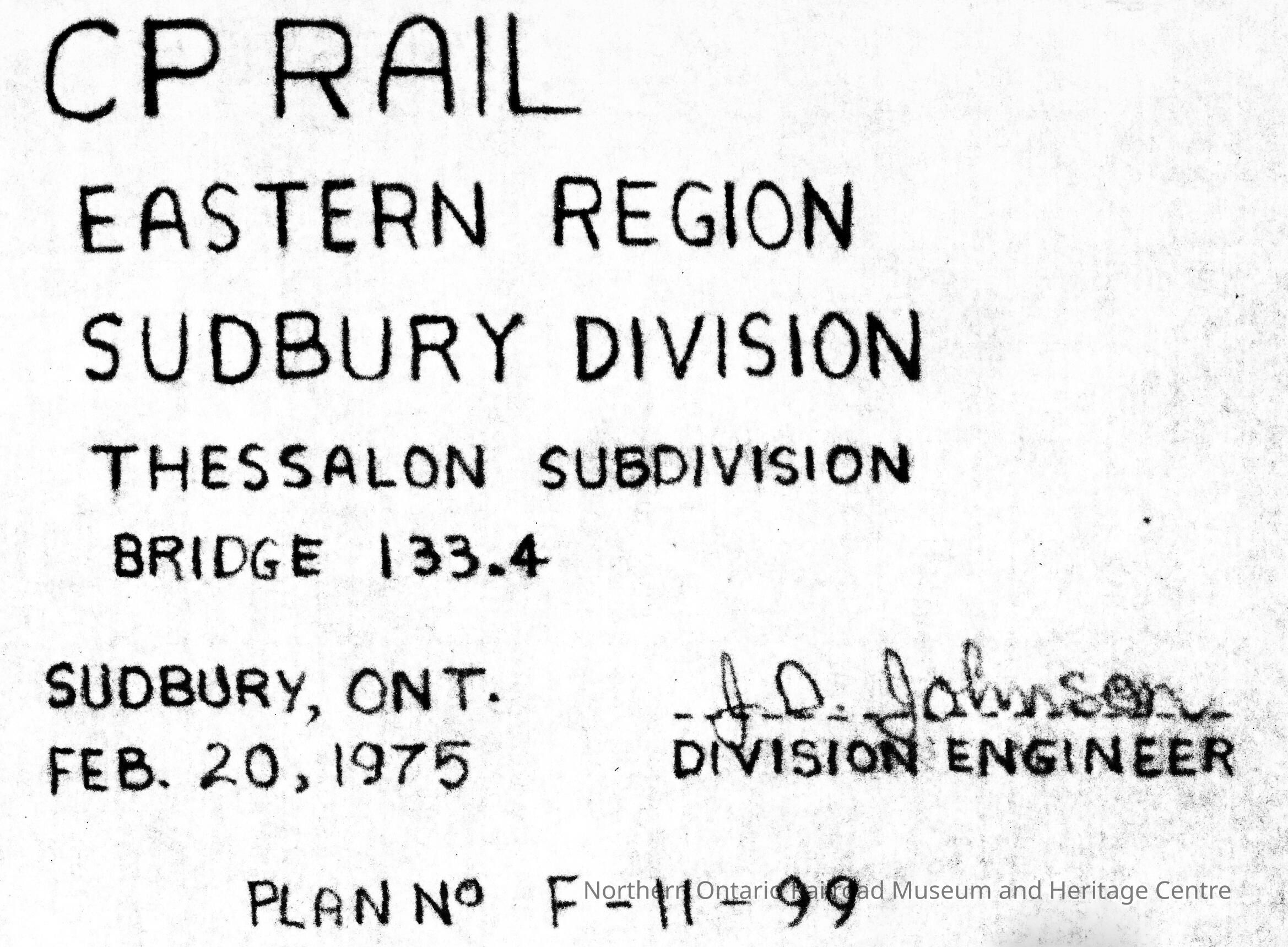 Document, Plan, Canadian Pacific Railways, Eastern Region, Sudbury Division, Thessalon Subdivision, Bridge 133.4, Sudbury, Ontario, February 20th 1975.Collection
