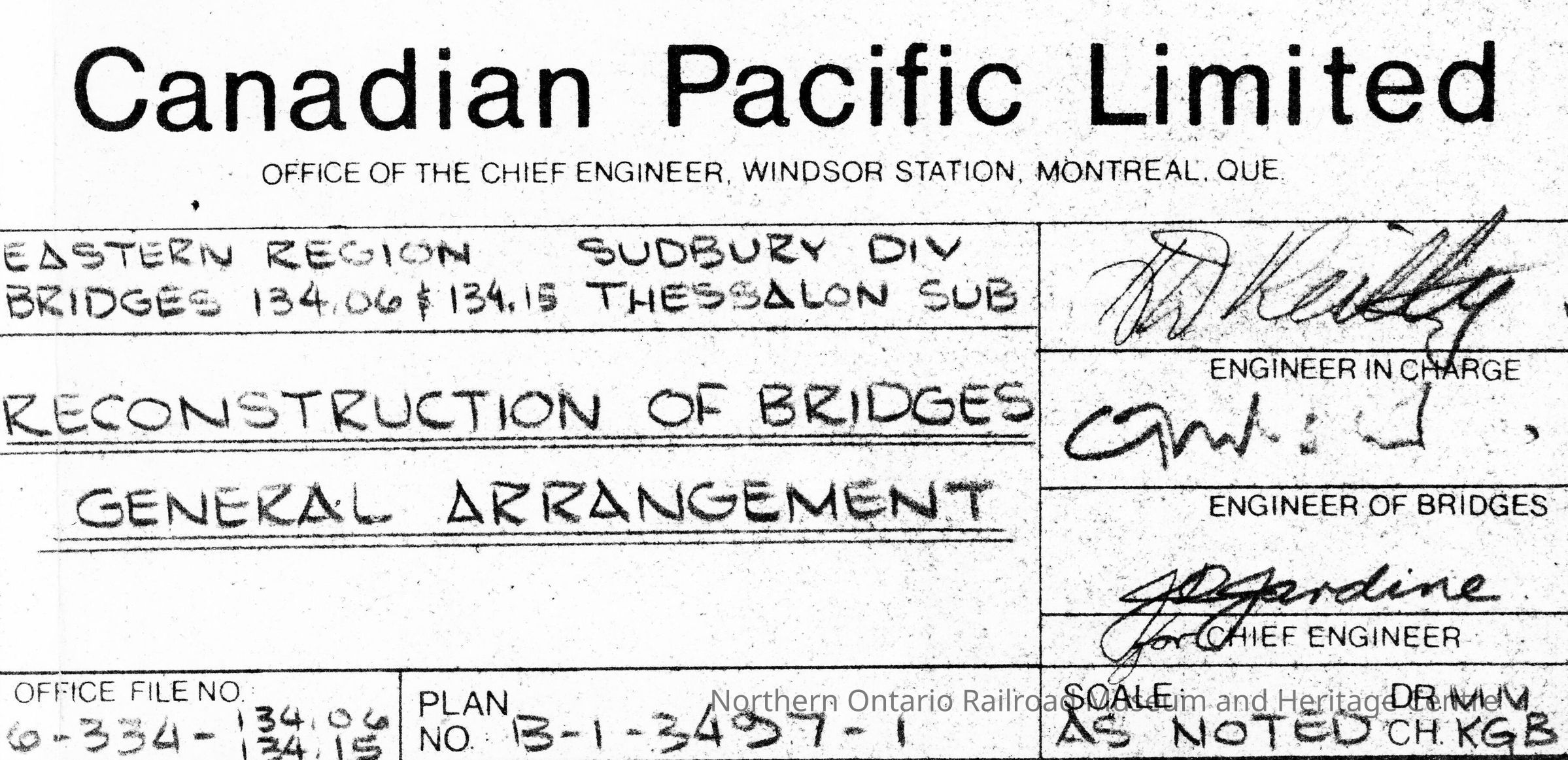Document, Plan, Canadian Pacific Railways, Eastern Region, Sudbury Division, Thessalon Subdivision, Bridges 134.06 & 134.15, Reconstruction of Bridges, General Arrangement.Collection