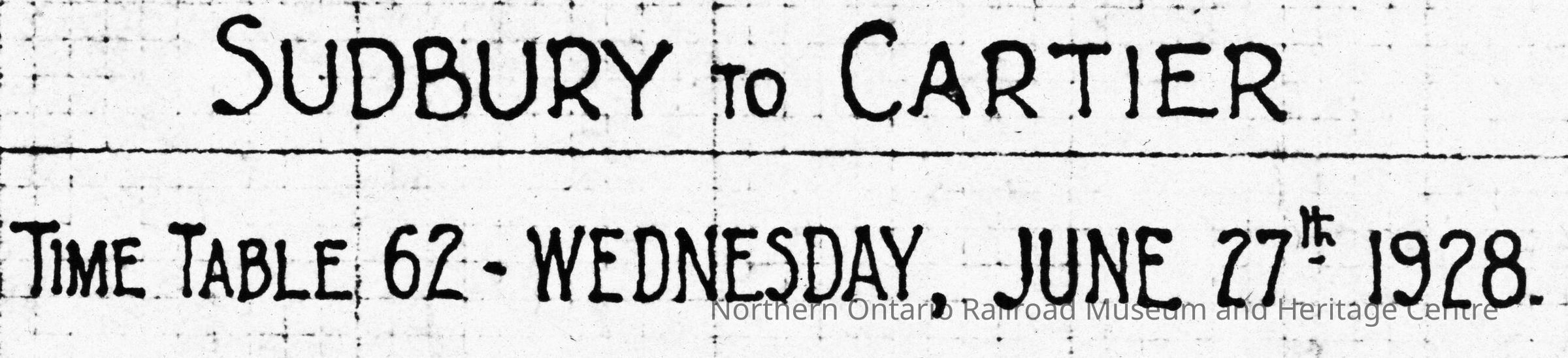 Document, Plan, Sudbury to Cartier, Timetable 62, Wednesday June 27th 1928.Collection